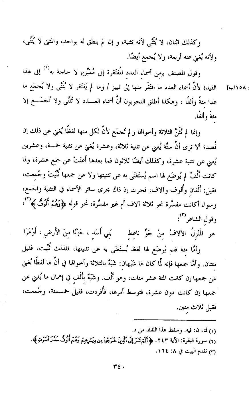 وإنما لم تثني الثلاثة وأخواتها ولم تجمع لان لكل منها لفظا يغني عن ذلك ان قصد , ألا تري أن ستة يغني عن تثنيه ثلاثة , وعشره يغني عن تثنيه خمسه ,وعشرون يغني عن تثنيه عشره , وكذلك أيضا ثلاثون فما بعدها أغنت جمع عشره ولما كانت ألف لم يوضع لها اسم يستغني به عن تثنيتها ولا عن جمعها ثنيت وجمعت فقيل: ألفان وألوف وآلاف ,فجرت إذا ذاك مجري سائر الأسماء في التثنية والجمع , وسواء أكانت مفسره نحو ثلاثة ألاف أم غير مفسره , نحو قوله (وهم ألوف) وقول الشاعر