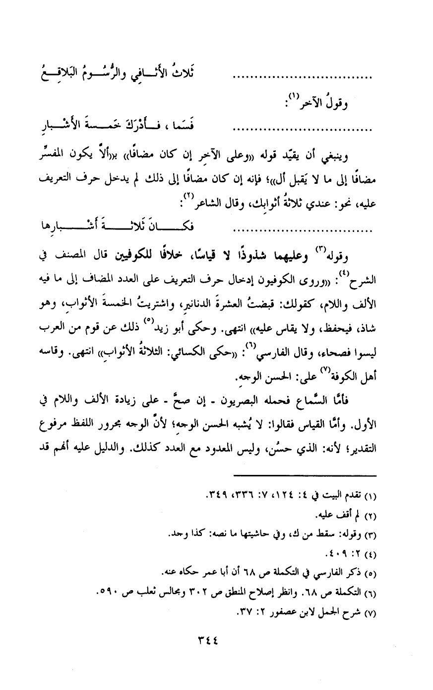 وينبغي ان يقيد قوله «وعل الأخر أن كان مضافا» ب «ألا يكون المفسر مضافا إلي مالا يقبل أل» , فانه أن كان مضافا إلي ذلك لم يدخل حرف التعريف عليه , نحو عندي ثلاثة أثوابك , وقال الشاعر: