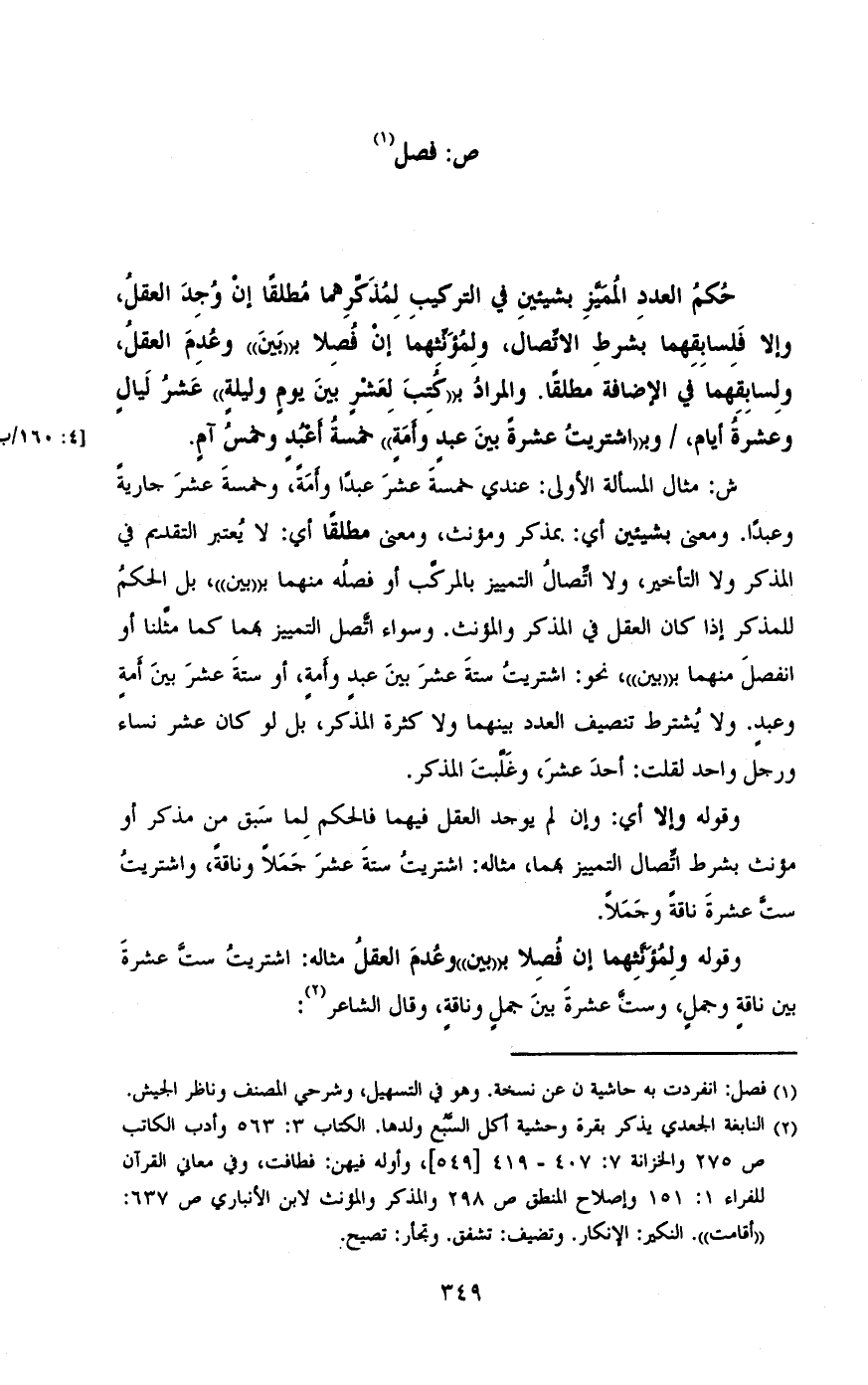 حكم العدد المميز بشيئين في التركيب لمذكرهما مطلقا أن وجد العقل , وإلا فلسابقهما بشرط الاتصال , ومؤنثهما أن فصلا ب (بين) وعدم العقل , ولسابقهما في الإضافة مطلقا. والمراد ب «كتب لعشر بين يوم وليله» عشر ليال وعشره أيام / وب «اشتريت عشره بين عبد وأمه» خمس اعبد وخمس آم.]-
