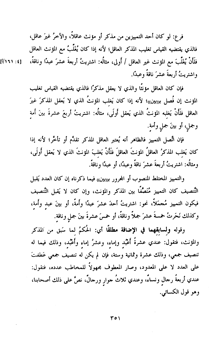 فإن كان العاقل مؤنثا والذي لا يعقل مذكرا فالذي يقتضيه القياس تغليب المؤنث إن فصل ب «بين «،لأنه إذا كان يغلب المؤنث الذي لا يعقل المذكر غير العاقل فلأن يغلبه المؤنث الذي لا يعقل الذكر غير العاقل فلأن يغلبه المؤنث الذي يعقل أولي، مثاله: اشتريت أربع عشرة بين أمه وجمل، أو بين جمل وأمه ... فإن اتصل التمييز فالظاهر أنه يعتبر العاقل المذكر تقدم أو تأخر، لأنه إذا كان يغلب المذكر العاقل المؤنث العاقل فلآن يغلب المؤنث الذي لا يعقل أولي، ومثاله: اشتريت أربعه عشر ناقة وعبدا، أو عبدا وناقة ... والتمييز المختلط المنصوب أو المجرور ب «بين «فيما ذكرناه إن كان العد يقبل التصنيف كان التمييز منصفا بين المذكر والمؤنث، وإن كان لا يقبل التنصيف فيكون التمييز مجملا، نحو: اشتريت أحد عشر عبدا وأمه، أو بين عبد وأمه، وكذلك نحرت خمسه جملا وناقة، أو خمس عشرة بين جمل وناقة. ... وقوله ولسابقهما في الإضافة مطلقا أي: الحكم لما سبق من المذكر والمؤنث، فتقول: عندي عشرة أعبد وإماء، وعشر إماء وأعبد، وذلك فيما له تنصيف جمعي، وذلك عشرة وثمانية وستة، فإن لم يكن تنصيف جمعي عطفت علي العدد لا علي المعدود، وصار المعطوف مجهولا للمخاطب عدده، فتقول: عندي أربعه رجال ونساء، وعندي ثلاث جوار ورجال، نص علي ذلك أصحابنا وهو قول الكسائي