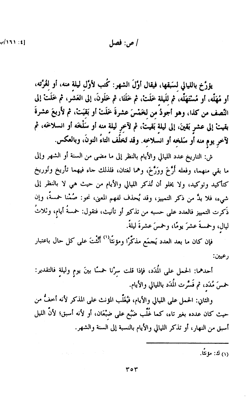 يؤرخ بالليالي لسبقها، فيقال أول الشهر: كتب لأول ليلة منه، أول لغرته، أو مهله، أو مستهله، ثم لليله خلت، ثم خلتا، ثم خلون، إلي العشر، ثم خلت إلي النصف من كذا، وهو أجود من لخمس عشرة خلت أو بقيت، ثم لأربع عشرة بقيت إلي عشر بقيت، إلي ليلة بقيت، ثم لآخر ليلة منه أو سلخه أو انسلاخه، ثم لآخر يوم منه أو سلخه أو انسلاخه. وقد تخلف التاء النون وبالعكس. ... ش: التاريخ عدد الليالي والأيام بالنظر إلي ما مض من السنة أو الشهر وإلي ما بقي منهما، وفعله أرخ وورخ، وهما لغتان، فلذلك جاء فيهما تأريخ وتوريخ كتأكيد وتوكيد، ولا يخلو أن تذكر الليالي والأيام من حيث هي لا بالنظر إلي شيء، فلا بد من ذكر التمييز، وقد يحذف لفهم المعني. نحو صمنا خمسه، وإن ذكرت التمييز فالعدد علي حسبه من تذكير أو تأنيث، فتقول: خمسه أيام، وثلاث ليال، وخمسه عشر يوما، وخمس عشره ليلة.