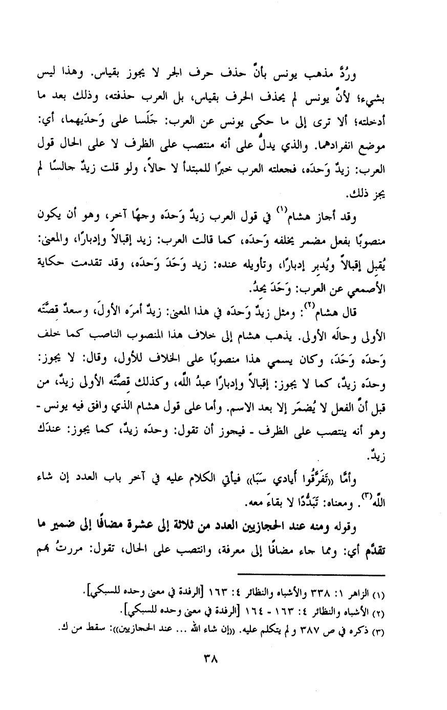ورد مذهب يونس بأن حذف حرف الجر لا يجوز بقياس. وهذا ليس بشيء؛ لأن يونس لم يحذف الحرف بقياس , بل العرب حذفته , وذلك بعد ما أدخلته؛ ألا تري إلى ما يحكي يونس عن العرب: جلسا علي وحديهما , أي: موضع انفرادهما. والذي يدل علي أنه منتصب علي الظرف لي علي الحال قول العرب: زيد وحده , فجعلته العرب خبرا للمبتدأ لا حالا ولو قلت زيد جالسا لم يجز ذلك.