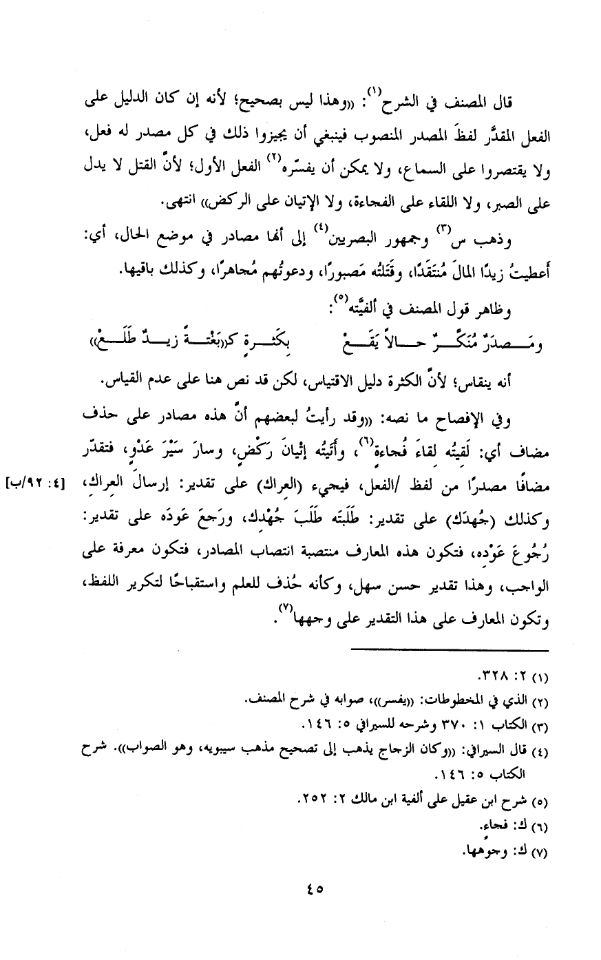 قال المصنف في الشرح: «وهذا ليس بصحيح؛ لأنه ان كان الدليل علي الفعل المقدر لفظ المصدر المنصوب فينبغي أن يجيزوا ذلك في كل مصدر له فعل , ولا يقتصروا علي السماع , ولا يمكن أن يفسره الفعل الأول؛ لأن القتل لا يدل علي الصبر , ولا اللقاء علي الفجاءة , ولا الإتيان علي الركض» انتهي.
