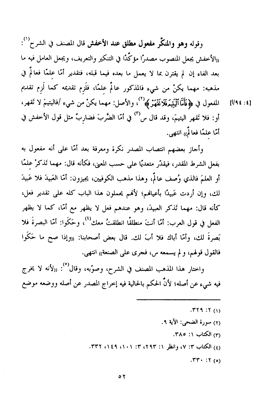 وقوله وهو والمنكر مفعول مطلق عند الاخفش قال المصنف في الشرح: «الاخفش يجعل المنصوب مصدرا مؤكدا في التنكير والتعريف , ويجعل العامل فيه ما بعد الفاء ان لم يقترن بما لا يعمل ما بعده فيما قبله , فتقدير أما علما فعا لم في مذهبه: مهما يكن من شيء فالمذكور عالم علما , فلزم تقديمه كما لزم تقديم المفعول في (فأما إلىتيم فلا تقهر) , والأصل: مهما يكن من شيء / فاليتيم لا تقهر , أو: فلا تقهر اليتيم , وقد قال س في أما الضرب فضارب مثل قول الاخفش في أما علما فعا لم» انتهي.