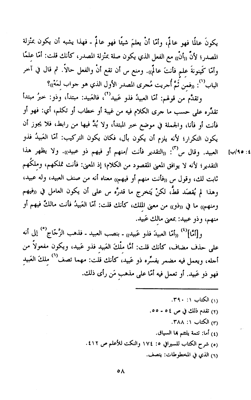وتقدم من قولهم: أما العبيد فذو عبيد , فالعبيد: مبتدأ وذو: خبر مبتدأ تقدره علي حسب ما جري الكلام فيه من غيبة أو خطاب أو تكلم , أي: فهو أو فأنت أو فانا , والجملة في موضع خبر المبتدأ , ولا بد فيها من رابط , فلا يجوز ان يكون التكرار؛ لأنه يلزم أن يكون بال , فكان التركيب: أما العبيد فذو العبيد. وقال س: «التقدير فأنت / منهم أو فيهم ذو عبيد». ولا يظهر هذا التقدير؛ لأنه لا يوافق المعني المقصود من الكلام؛ إذ المعني: فأنت تملكهم , وملكهم ثابت لك , وقول س «فأنت منهم أو فيهم» معناه انه من صنف العبيد , وله عبيد , وهذا لم يقصد قط , لكن يتخرج ما قدره س علي أن يكون العامل في «فيهم ومنهم» ما في «ذو» من معني الملك , كأنك قلت: أما العبيد فأنت مالك فيهم أو منهم وذو عبيد: بمعني مالك عبيد.