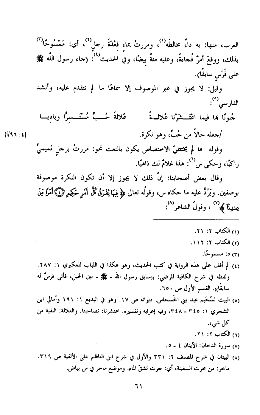 وقال بعض أصحابنا: إن ذلك لا يجوز إلا أن تكون النكرة موصوفة بوصفين. ويرد عليه ما حكاه س، وقوله تعالي {فِيهَا يُفْرَقُ كُلُّ أَمْرٍ حَكِيمٍ} [الدخان:4] {أَمْرًا مِنْ عِنْدِنَا إِنَّا كُنَّا مُرْسِلِينَ} [الدخان:5]