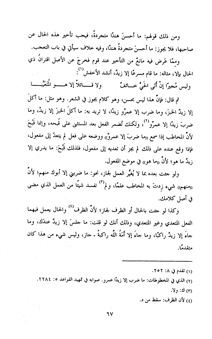 ومن ذلك قولهم: ما أحسن هندا متجردة، فيجب تأخير هذه الحال عن صاحبها، فلا يجوز: ما أحسن متجردة هندا، وفيه خلاف سيأتي في باب التعجب.