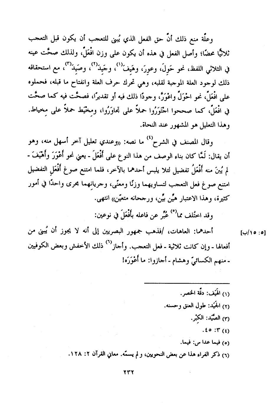وعلة منع ذلك أنَّ حق الفعل الذي يُبنى للتعجب أن يكون قبل التعجب ثلاثيَّا محضًا؛ وأصل الفعل في هذه أن يكون على وزن افْعَلَّ، ولذلك صحَّت عينه في الثلاثي اللفظ، نحو حَوِلَ، وعوِرَ، وهَيفَ، وجَيِدَ، وصَيِدَ، مع استحقاقه ذلك لوجود العلة الموجبة لقلبه، وهي تحرك حرف العلة وانفتاح ما قلبه، فحملوه على افْعَلَّ، نحو احْوَلَّ واعْوَرَّ، وجودًا ذلك فيه أو تقديرًا، فصحَّت فيه كما صحَّت في افْعَلَّ، كما صححوا اجْتَوَرُوا حملاً على تجاوَرُوا، ومِخْيَط حملاً على مخياط.
