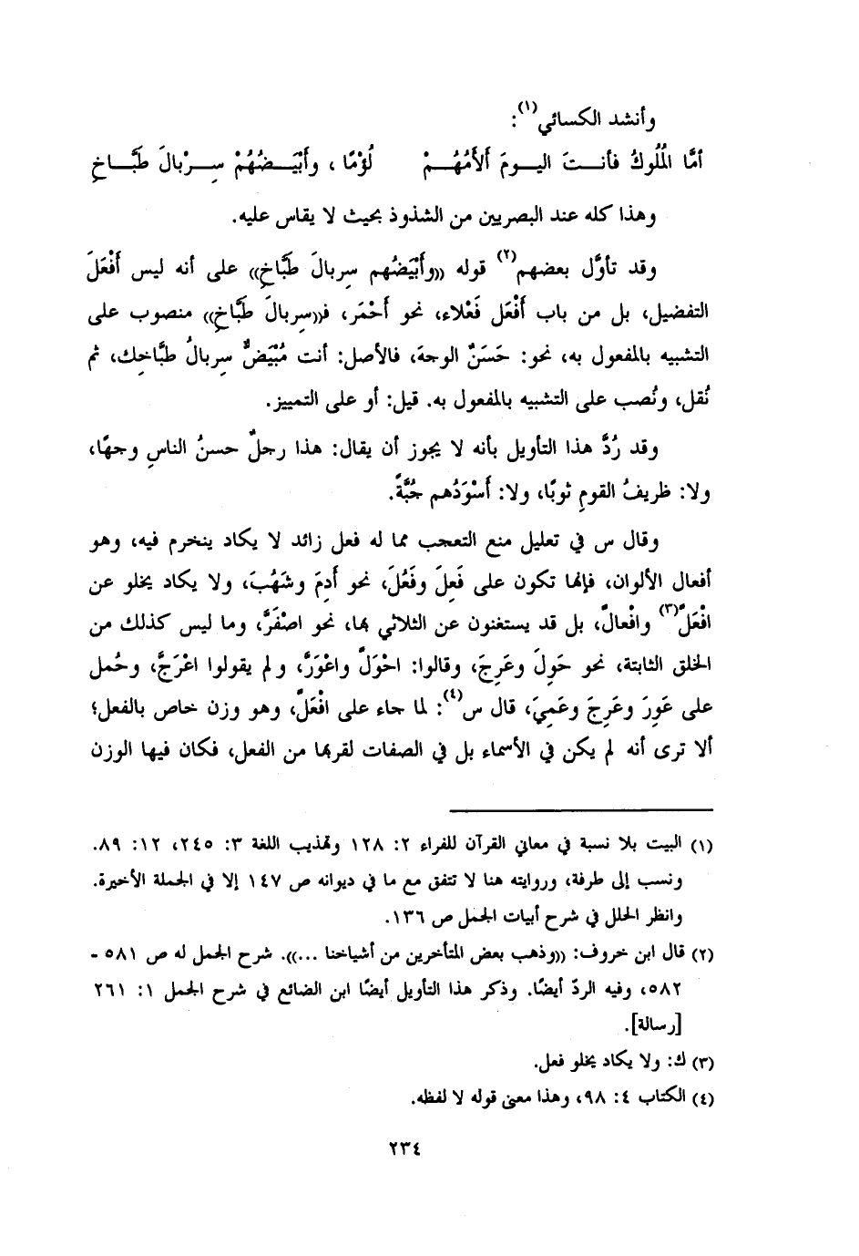 وقد تأوَّل بعضهم قوله «وأَبيضهُم سِربالَ طَبَّاخِ» على أنه ليس أَفْعَلَ التفضيل، بل من باب أَفْعَل فَعْلاء، نحو أحْمرَ، فـ «سِربالَ طَبّاخ» منصوب على التشبيه بالمفعول به، نحو: حَسَنٌ الوجهَ، فالأصل: أنت مُبْيَضُّ سِربالُ طبَّاخِك، ثم نُقل، ونُصب على التشبيه بالمفعول به. قيل أو على التمييز.