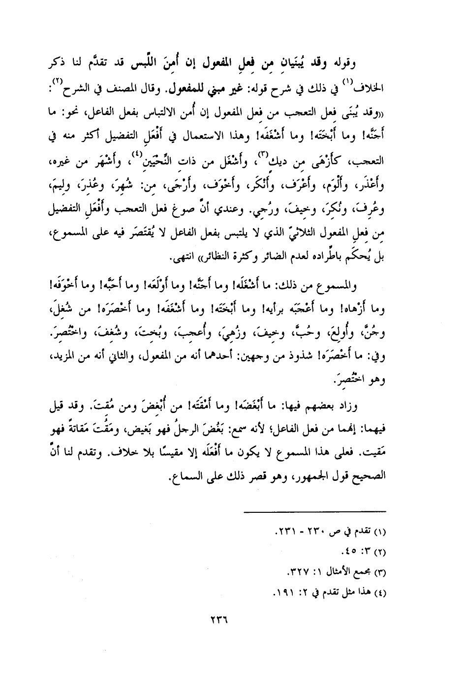 والمسموع من ذلك: ما أَشْغَلَه! وما أَجَنَّه! وما أَجَنَّه! وما أَوْلَعَه! وما أَجَبَّه! وما أَخْوَفَه! وما أزْهاه! وما أَجْبَبَه برأيه! وما أَبْخَتَه! وما أَشْغَفَه! وما أَخْصَرَه! من شُغِلَ، وجُنَّ، وأُولِعَ، وحُبَّ، وخِيفَ، وزُهِيَ، وأُعجِبَ، وبُخِتَ، وشُغِفَ، واخْتُصِرَ.