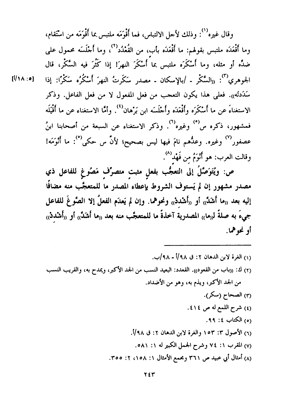 فعلى هذا يكون التعجب من فعل المفعول لا من فعل الفاعل. وذكر الاستغناءَ عن ما أسْكَرَه وأقْعَدَه وأجْلَسَه ابن بَرْهان. وأمَّا الاستغناء عن ما أَقْيَلَه فمشهور، ذكره س وغيره. وذكر الاستغناء عن السبعة من أصحابنا ابن عصفور وغيره. وعدُّهم نامَ فيها ليس بصحيح؛ لأنَّ س حكى 5: ما أَنْوَمَه!