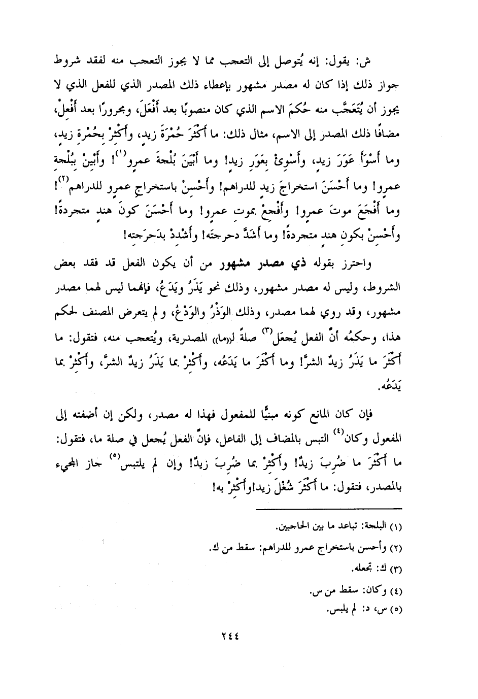 ش: يقول: إنه يُتوصل إلى التعجب مما لا يجوز التعجب منه لفقد شروط جواز ذلك إذا كان له مصدر مشهور بإعطاء ذلك المصدر الذي للفعل لا يجوز أن يُتَعَجَّب منه حُكمَ الاسم الذي كان منصوبًا بعد أَفْعَلَ، ومجرورًا بعد أَفْعِلْ، مضافًا ذلك المصدر إلى الاسم، مثال ذلك: ما أَكْثَرَ حُمْرَةَ زيدٍ، وأَكْثِرْ بحُمْرةِ زيدٍ، وما أَسْوَأَ عَوَرَ زيدٍ، وأَسْوِئْ بَعَورِ زيد! وما أَبْيَنَ بُلْجةَ عمرٍو! وأَبْيَنْ بِبُلْجة عمرٍو! وما أَحْسَنَ استخراجَ زيدٍ للدراهم! وأَحْسِنْ باستخراجِ عمرٍو للدراهم! وما أَفْجَعَ موتَ عمرٍو! وأَفْجِعْ بموتِ عمرٍو! وما أَحْسَنَ كون هندٍ متجردةً! وأَحْسِنْ بكونِ هندٍ متجردةً! وما أشَدَّ دحرجَته! وما أَشْددْ بَدحرَجته!