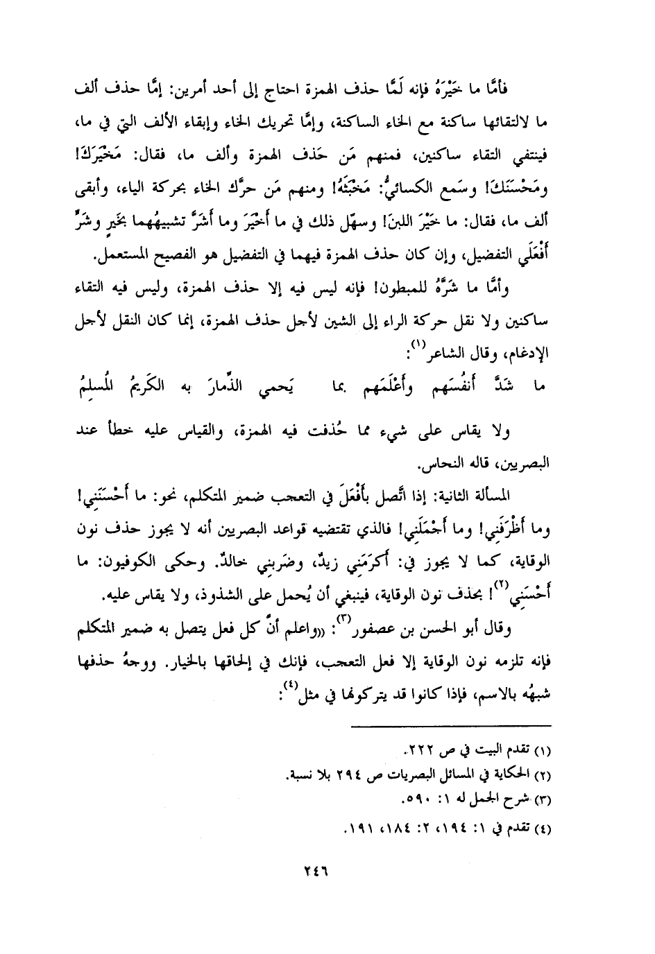 وقال أبو الحسن بن عصفور: «واعلم أنَّ كل فعل يتصل به ضمير المتكلم فإنه تلزمه نون الوقاية إلا فعل التعجب، فإنك في إلحاقها بالخيار. ووجهُ حذفها شبهُه بالاسم، فإذا كانوا قد يتركونها في مثل: