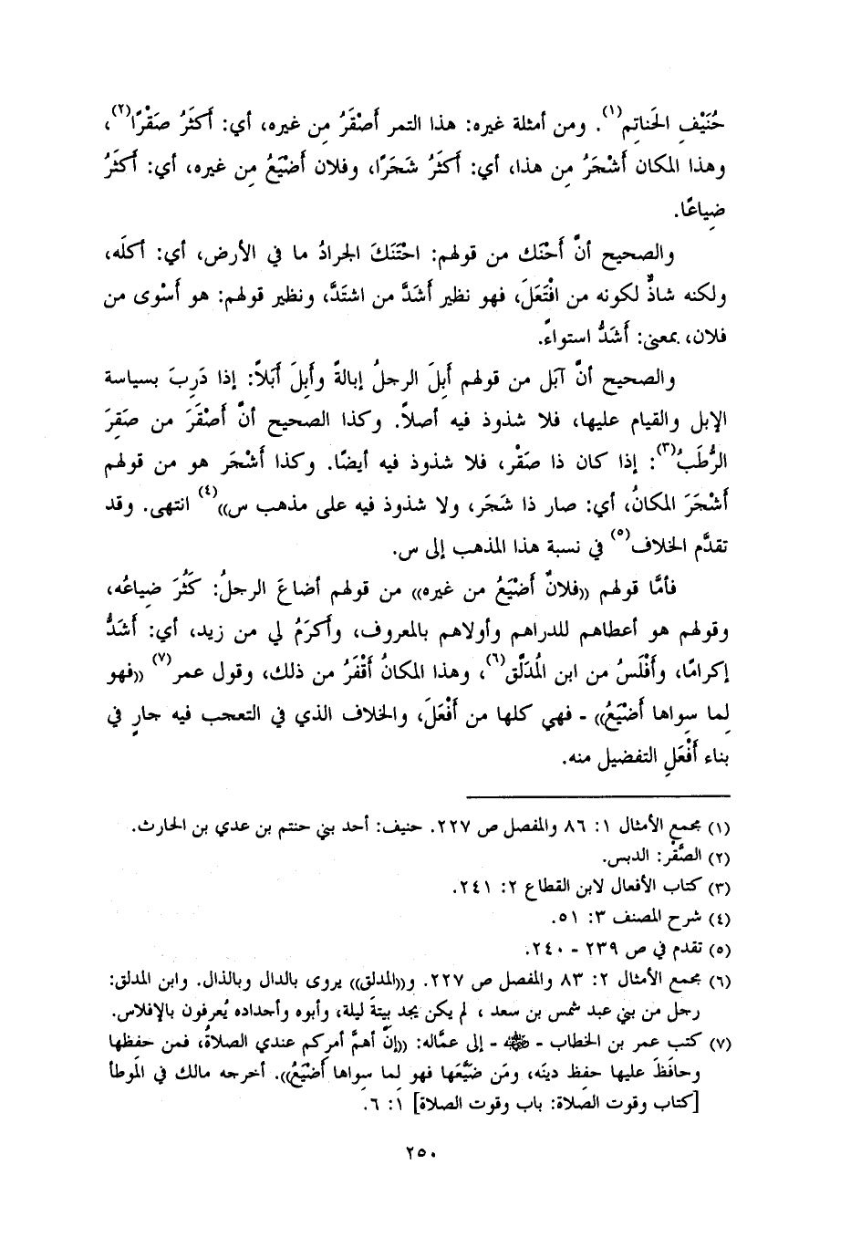 حُنَيْفِ الحَناتِم. ومن أمثلة غيره: هذا التمر أَصْقَرُ مِن غيره، أي: أَكثَرُ صَقْرًا، وهذا المكان أَشْجَرُ مِن هذا، أي: أَكثَرُ شَجَرًا، وفلان أَضْيَعُ مِن غيره، أي: أَكثَرُ ضياعًا.