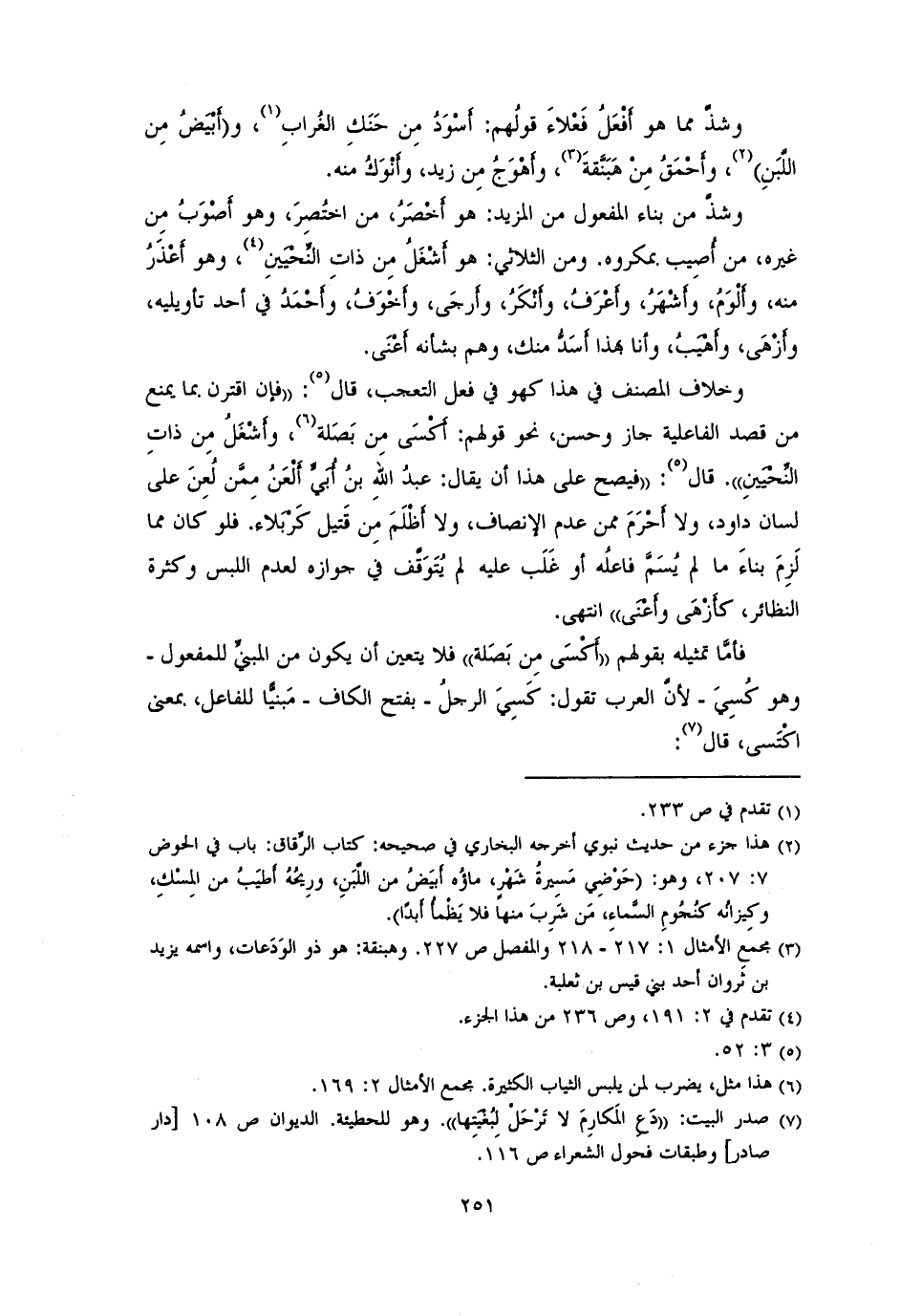 وشذَّ مما هو أَفْعَلُ فَعْلاَء قولُهم: أَسْوَدُ مِن حَنَكِ الغُرابِ، و (أَبْيَضُ مِن الَّلبَنِ)، وأَحْمَقُ مِنْ هَبَنَّقةَ، وأَهْوَجُ مِن زيد، وأَنْوَكُ منه.