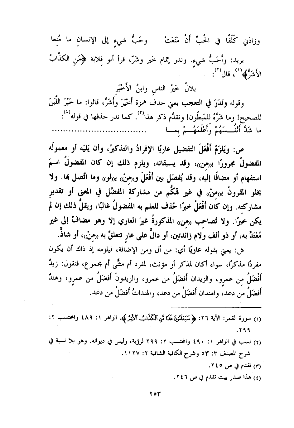 المفضولُ مجرورًا بـ «مِن»، وقد يسبقانه، ويلزم ذلك إن كان المفضولُ اسمَ استفهام أو مضافًا إليه، وقد يُفصَل بين أَفْعَلَ و «مِنْ» بـ «لو» وما اتَّصل بها. ولا يخلو المقرونُ بـ «مِنْ» في غير تهكُّم من مشاركِة المفضَّل في المعنى أو تقديرِ مشاكته. وإن كان أَفْعَلُ خبرًا حُذف للعلم به المفضولُ غالبًا، ويقلُّ ذلك إن لم يكن خبرًا. ولا تُصاحب «مِن» المذكورةُ غيرَ العاري إلا وهو مضافٌ إلى غير مُعْتَدِّ به، أو ذو ألف ولام زائدتين، أو دالَّ على عارٍ تتعلقَّ به «مِنْ»، أو شاذُّ.]-