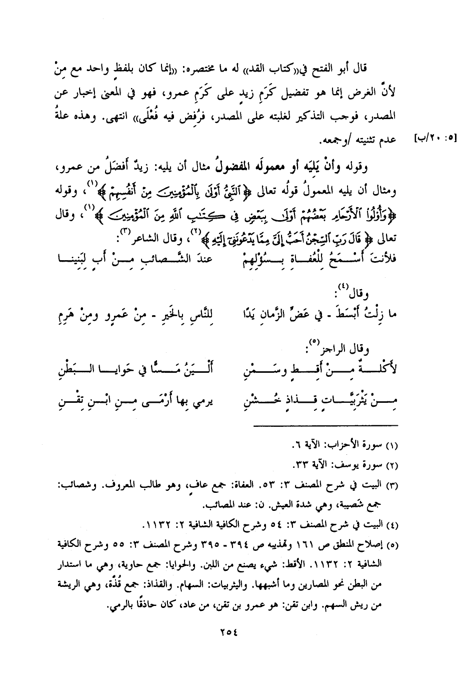 وقوله وأنْ يَليَه أو معمولَه المفضولُ مثال أن يليه: زيدٌ أَفضَلُ من عمرو، ومثال أن يليه المعمولُ قولُه تعالى (النبى أولى بالمؤمنين من أنفسهم}، وقوله {وأولوا الأرحام بعضهم أولى ببعض في كتب الله من المؤمنين)} 1، وقال تعالى {قال رب السجن أحب إلى يدعوننى إليه)، وقال الشاعر: