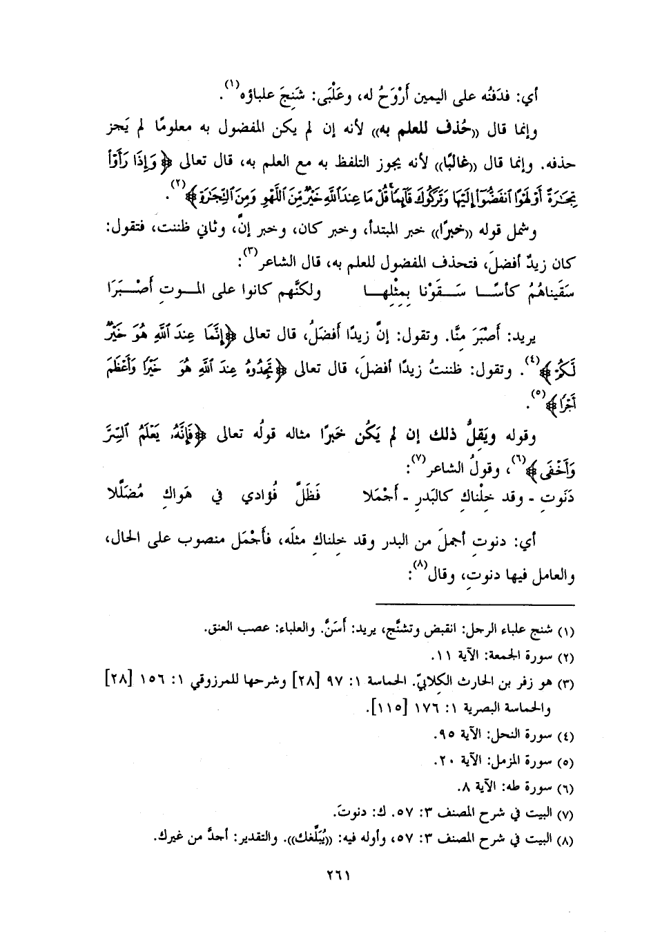 وإنما قال «حُذف للعلم به» لأنه إن لم يكن المفضول به معلومًا لم يَجز حذفه. وإنما قال «غالبًا» لأنه يجوز التلفظ به مع العلم به، قال تعالى {وإذا رأوا تجرة أو لهوا انفضوا إليهاوتركوك قائما قل ما عند الله خير من اللهو ومن التجرة}.