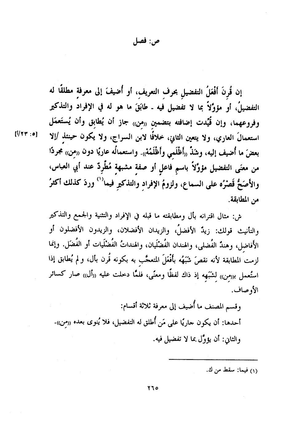 ش: مثال اقترانه بأل ومطابقته ما قبله في الإفراد والتثنية والجمع والتذكير والتأنيث قولك: زيدٌ الأفضلُ، والزيدان الأفضلان، والزيدون الأفضلون أو الأَفاضِل، وهندٌ الفُضلى، والهندان الفُضْلَيان، والهنداتُ الفُضْلَيات أو الفُضَل. وإنما لزمت المطابقة لأنه نقصَ شَبَهُه بأَفْعَلَ المتعجَّبِ به بكونه قُرن بأل، ولم يُطابق إذا استُعمل بـ «من» لشَبَهه إذ