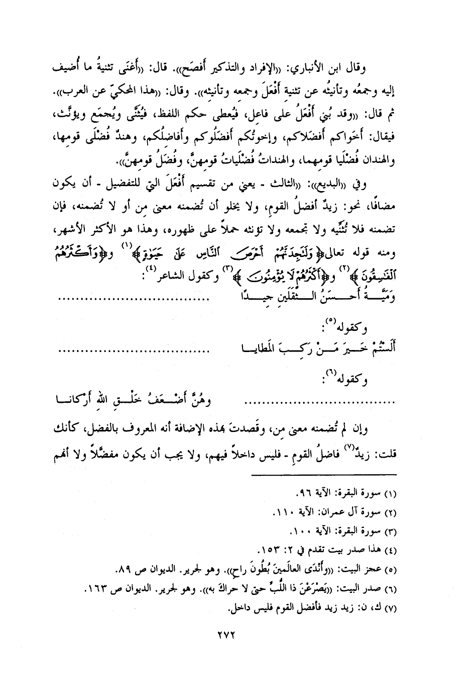 وفي «البديع»: «الثالث ــــ يعني من تقسيم أَفْعَلَ التي للتفضيل ـــ أن يكون مضافًا، نحو: زيدُ أفضلُ القومِ، ولا يخلو أن تُضمنه معنى مِن أو لا تُضمنه، فإن تضمنه فلا تُثَنيه ولا تجمعه ولا تؤنثه حملاً على ظهوره، وهذا هو الأكثر الأشهر، ومنه قوله تعالى {ولتجدنهم أحرص الناس على حيوة} و {وأكثرهم الفسقون} و {أكثرهم لا يومنون} وكقول الشاعر:
