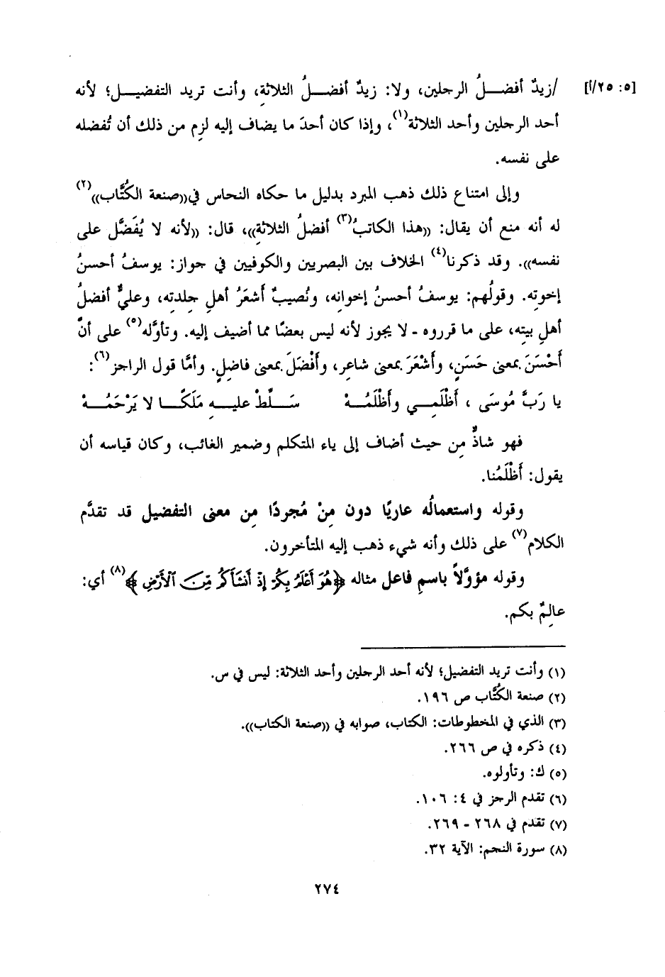 له أنه منع أن يقال: «هذا الكاتبُ أفضلُ الثلاثةِ»، قال: «لأنه لا يُفَضَّل على نفسه».