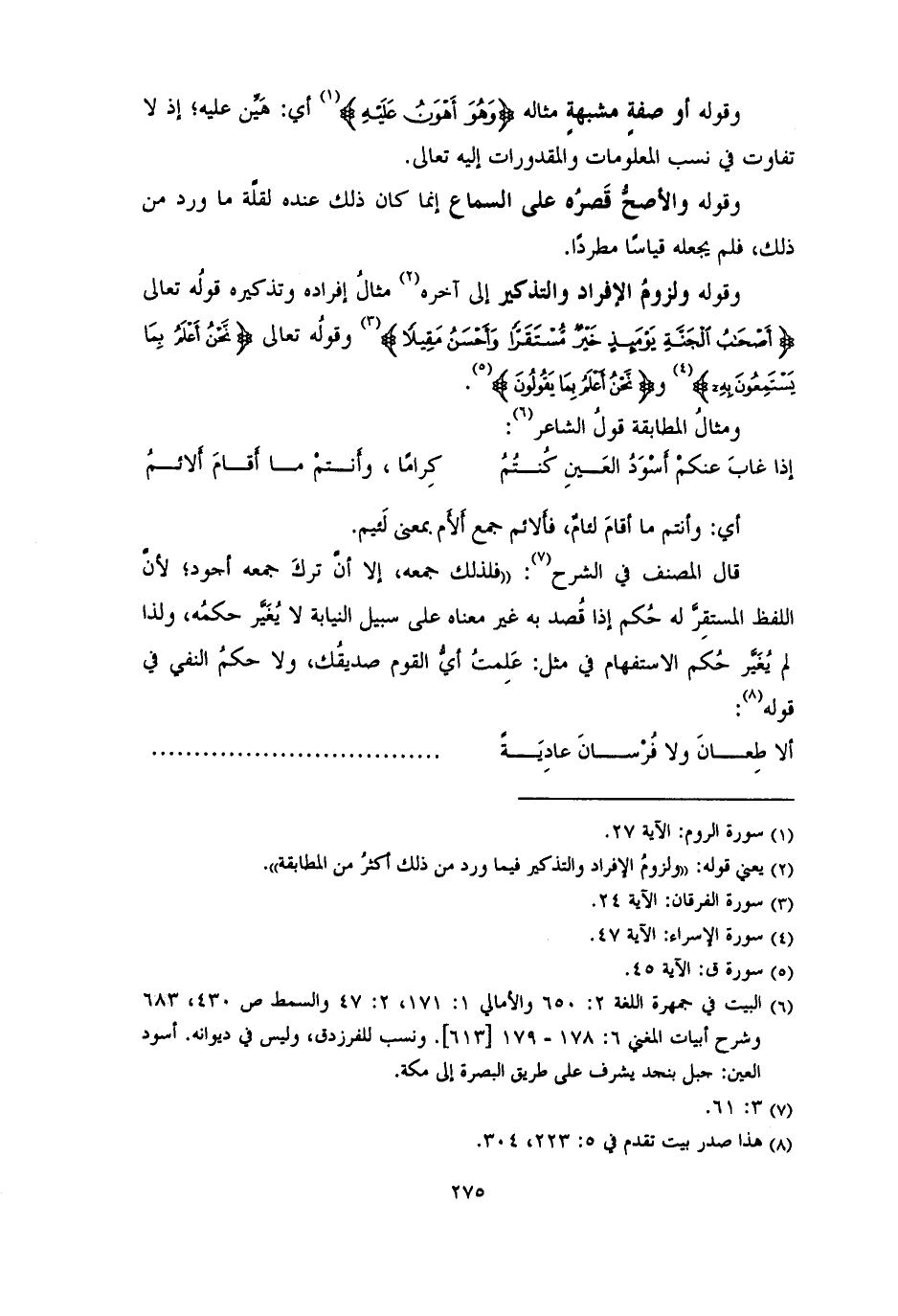 وقوله ولزومُ الإفراد والتذكير إلى آخره مثالُ إفراده وتذكيره قولُه تعالى {أصحب الجنة يوميذ خبر مسقرًا وأحسن مقيلا} وقوله تعالى {نحن أعلم بما يستمعون} و {نحن أعلم بما يقولون}.