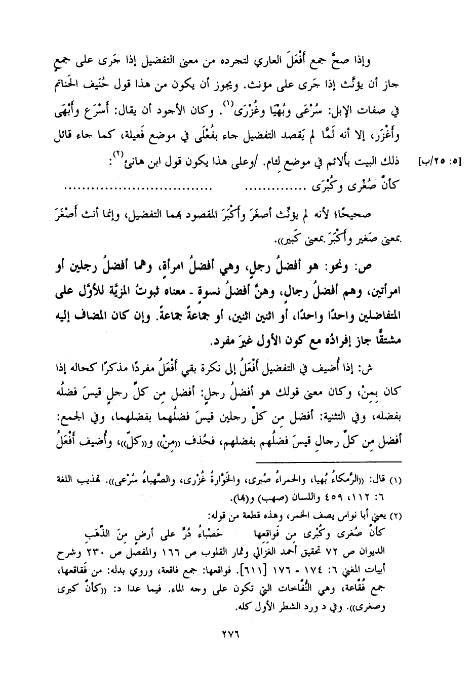 وإذا صحَّ جمع أَفْعَلَ العاري لتجرده من معنى التفضيل إذا جَرى على جمعٍ جاز أن يؤنَّث إذا جَرى على مؤنث. ويجوز أن يكون من هذا قول حُنَيف الحَناتم في صفات الإبل: سرعى وبُهْيَا وغُزْرَى. وكان الأجود أن يقال: أَسْرَع وأَسْرَع وأَبْهَى وأَغْزَر، إلا أنه لَمَّا لم يَقصد التفضيل جاء بفُعْلَى في موضع فَعيلة، كما جاء قائل ذلك البيت بألائم في موضع لئِام. /وعلى هذا يكون قول ابن هانئ: