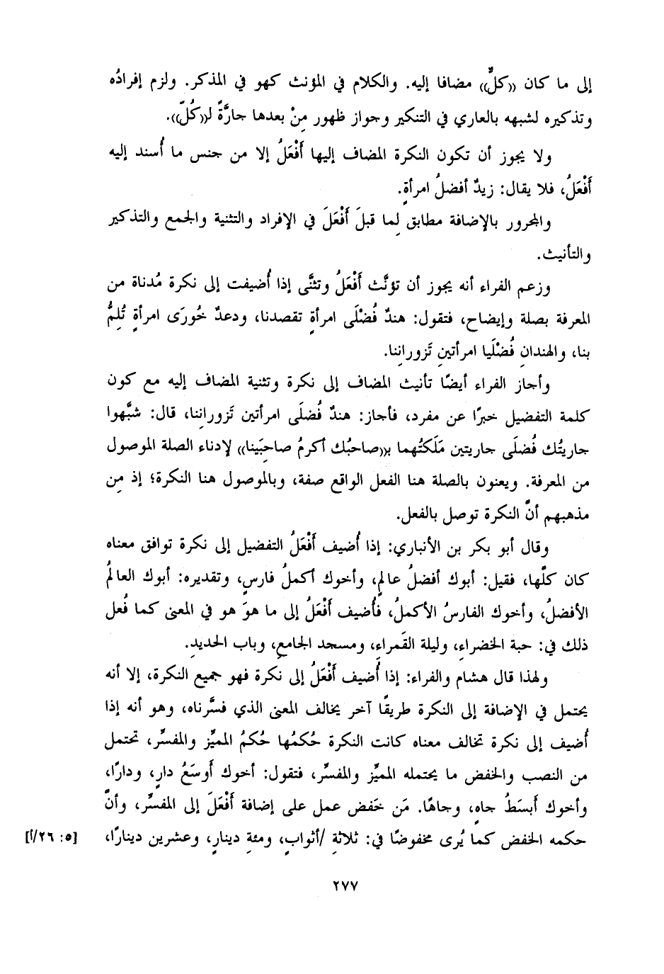 وأجاز الفراء أيضًا تأنيث المضاف إلى نكرة وتثنية المضاف إليه مع كون كلمه التفضيل خبرًا عن مفرد، فأجاز: هندٌ فُضلَى امرأتين تَزورانِنا، قال: شبَّهوا جاريتُك فُضلَى جاريتين مَلَكُتهما بـ «صاحبُك أكرمُ صاحبَينا» لإدناء الصلة الموصول من المعرفة. ويعنون بالصلة هنا الفعل الواقع صفة، وبالموصول هنا النكرة؛ إذ مِن مذهبهم أنَّ النكرة توصل بالفعل.
