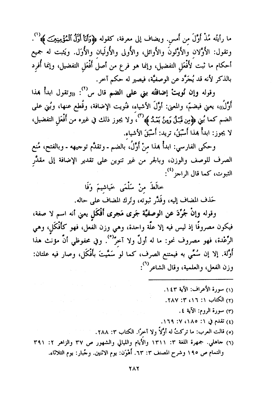 وقوله وإن نُويتْ إضافُته بني على الضم قال س: «وتقول ابدا بهذا أَوَّلُ»، يعني فيضمّ، والمعنى: أوَّلَ الأشياء، فُنويت الإضافة، وقُطع عنها، وبُني على الضم كما بُني {من قبل ومن بعد}، ولا يجوز ذلك في غيره من أَفْعَلِ التفضيل، لا يجوز: ابدا بهذا أَسْبَقُ، تريد: أَسْبَقَ الأشياء.