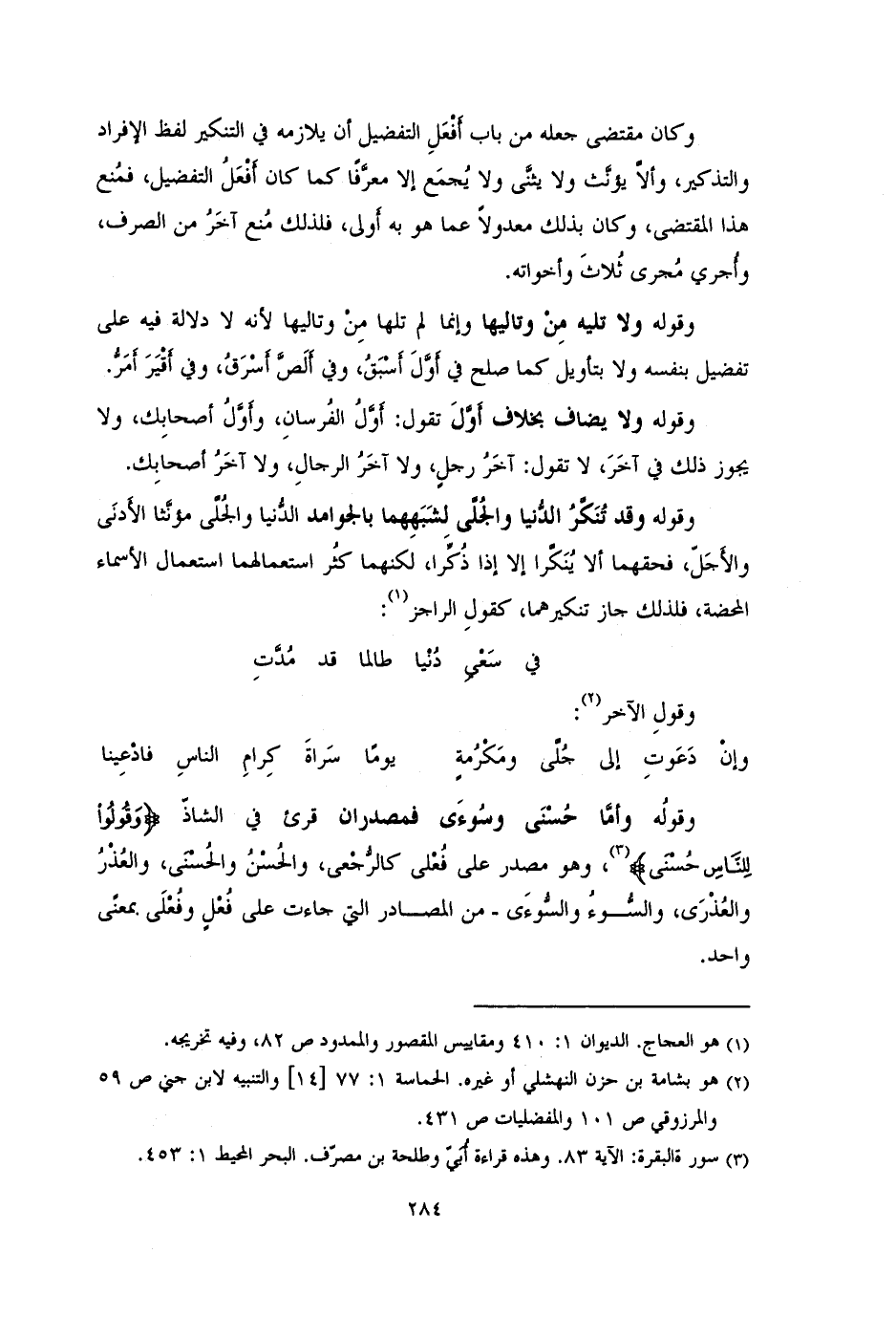وقولُه ... وأمَّا حُسْنَى ... وسُوءَى فمصدران قرئ في الشاذّ {وقولوا للناس حُسْنَى}، وهو مصدر على فُعْلى كالرُّجْعى، والحُسْنُ والحُسْنَى، والعُذْرُ والعُذْرَى، والسُّوءُ والسُّوءَى ــــ من المصادر التي جاءت على فُعْلٍ وفُعْلَى بمعنًى واحد.