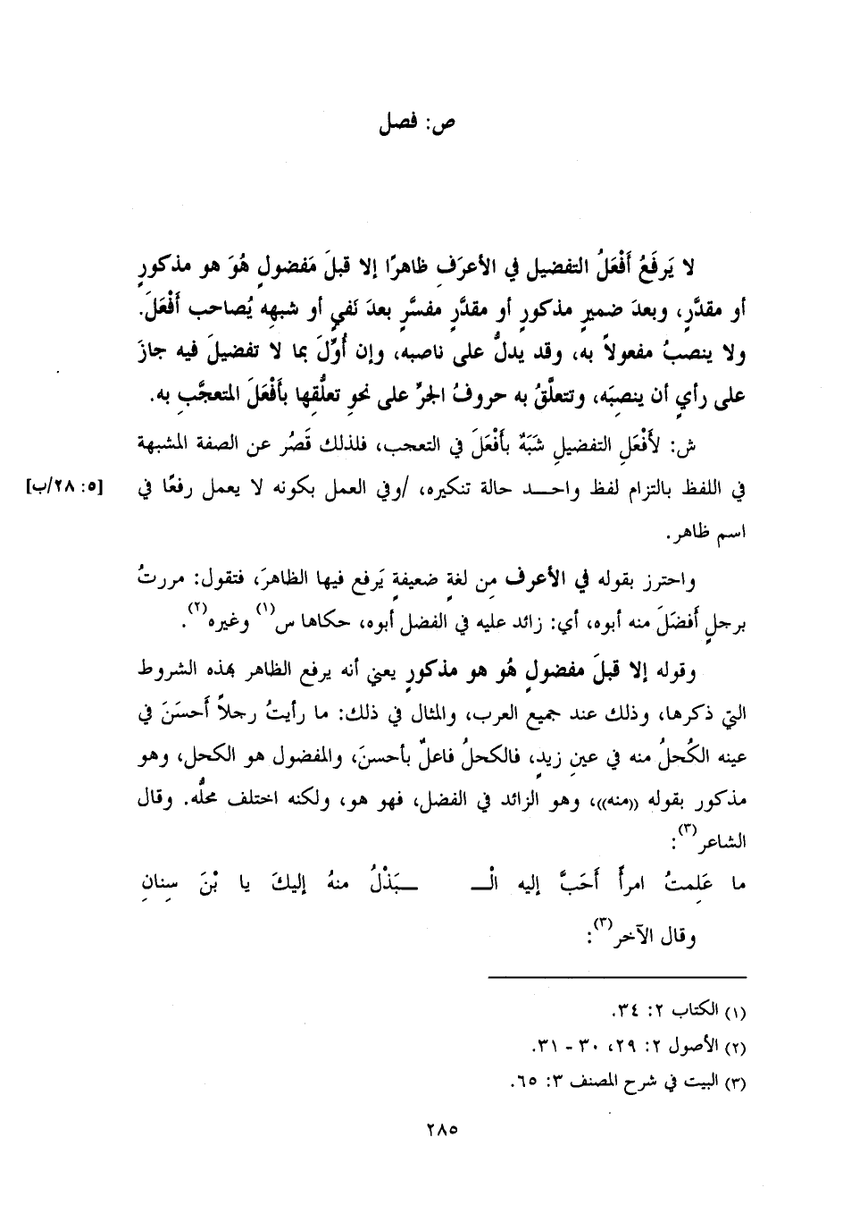 لا يَرفَعُ أَفْعَلُ التفضيل في الأعرَفِ ظاهرًا إلا قبلَ مَفضولٍ هُوَ مذكورٍ أو مقدَّرٍ، وبعدَ ضميرٍ مذكورٍ أومقدَّرٍ مفسَّرٍ بعدَ نَفي أو شبهِه يُصاحب أَفْعَل. ولا ينصبُ مفعولا به، وقد يدلُّ على ناصبه، وإن أُوَّلَ بما لا تفضيلَ فيه جازَ على رأيٍ أن ينصِبَه، وتتعلَّقُ به حروفُ الجرَّ على نحوِ تعلُّقِها بأَفْعَلَ المتعجَّبِ به.]-