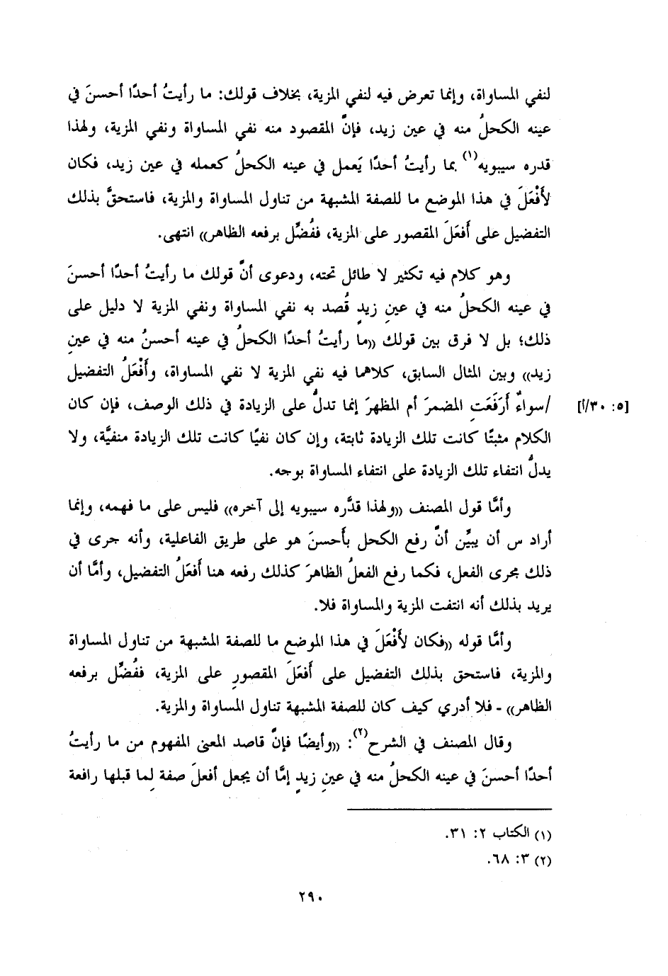 وهو كلام فيه تكثير لا طائل تحته، ودعوى أنَّ قولك ما رأيتُ أحدًا أحسنَ في عينه الكحلُ منه في عينِ زيدٍ قُصد به نفي المساواة ونفي الزية لا دليل على ذلك؛ بل لا فرق بين قولك «ما رأيتُ أحدًا الكحلُ في عينه أحسنُ منه في عينِ زيد» وبين المثال السابق، كلاهما فيه نفي المزية لا نفي المساواة، وأَفْعَلُ التفضيل /سواٌء أَرَفَعتِ المضمرَ إنما تدلُّ على الزيادة في ذلك الوصف، فإن كان الكلام مثبتًا كانت تلك الزيادة ثابتة، وإن كان نفيًا كانت تلك الزيادة منفيَّة، ولا يدلُّ انتفاء تلك الزيادة على انتفاء المساواة بوجه.