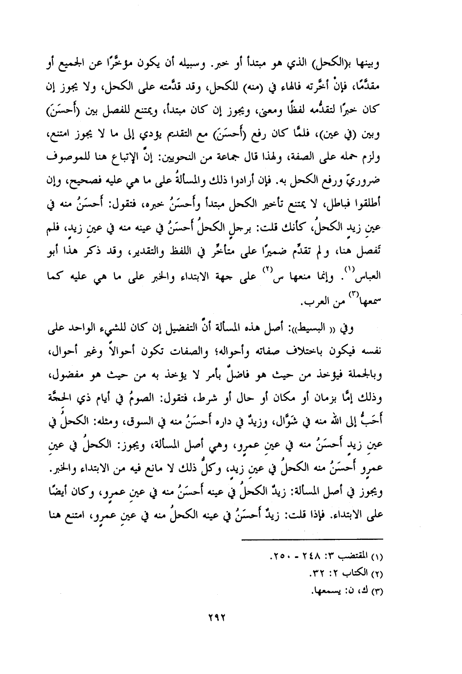 وفي «البسيط»: أصل هذه المسألة أنَّ التفضيل إن كان للشيء الواحد على نفسه فيكون باختلاف صفاته وأحواله؛ والصفات تكون أحوالاً وغير أحوال، وبالجملة فيؤخذ من حيث هو فاضلٌ بأمر لا يؤخذ به من حيث هو مفضول، وذلك إمَّا بزمان أو مكان أو حال أو شرط، فتقول: الصومُ في أيام ذي الحجَّة أَحَبُّ إلى الله منه في شَوَّال، وزيدٌ في داره أَحسَنُ منه في السوق، ومثله: الكحلُ في عينِ زيدٍ أَحسَنُ منه في عينِ عمرٍو، وهي أصل المسألة، ويجوز: الكحلُ في عينِ عمرٍو أحسَنُ منه الكحلُ في عينِ زيدٍ، وكلُّ ذلك لا مانع فيه من الابتداء والخبر. ويجوز في أصل المسألة: زيدٌ الكحلُ في عينه أَحسَنُ منه في عينِ عمرٍو، وكان أيضًا على الابتداء. فإذا قلت: زيدٌ أَحسَنُ في عينه الكحلُ منه في عينِ عمرٍو، امتنع هنا