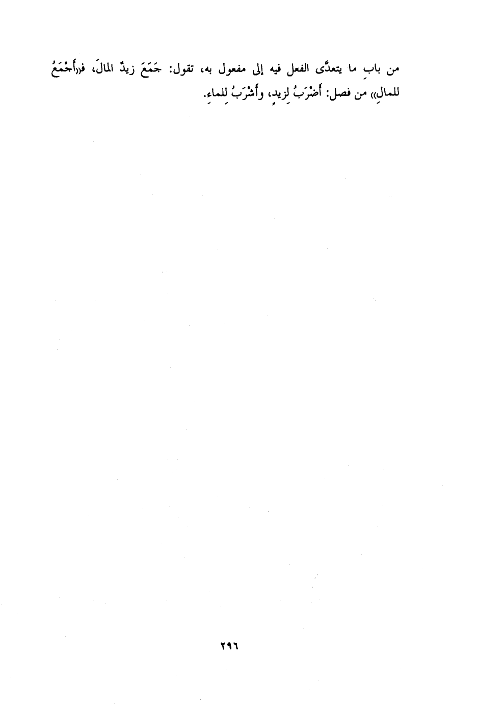 من باب ما يتعدَّى الفعل فيه إلى مفعول به، فتقول: جَمَعَ زيدٌ المالَ، فـ «أَجْمَعُ للمالِ» من فصل: أَضْرَبُ لزيدٍ، وأَشْرَبُ لِلماءِ.
