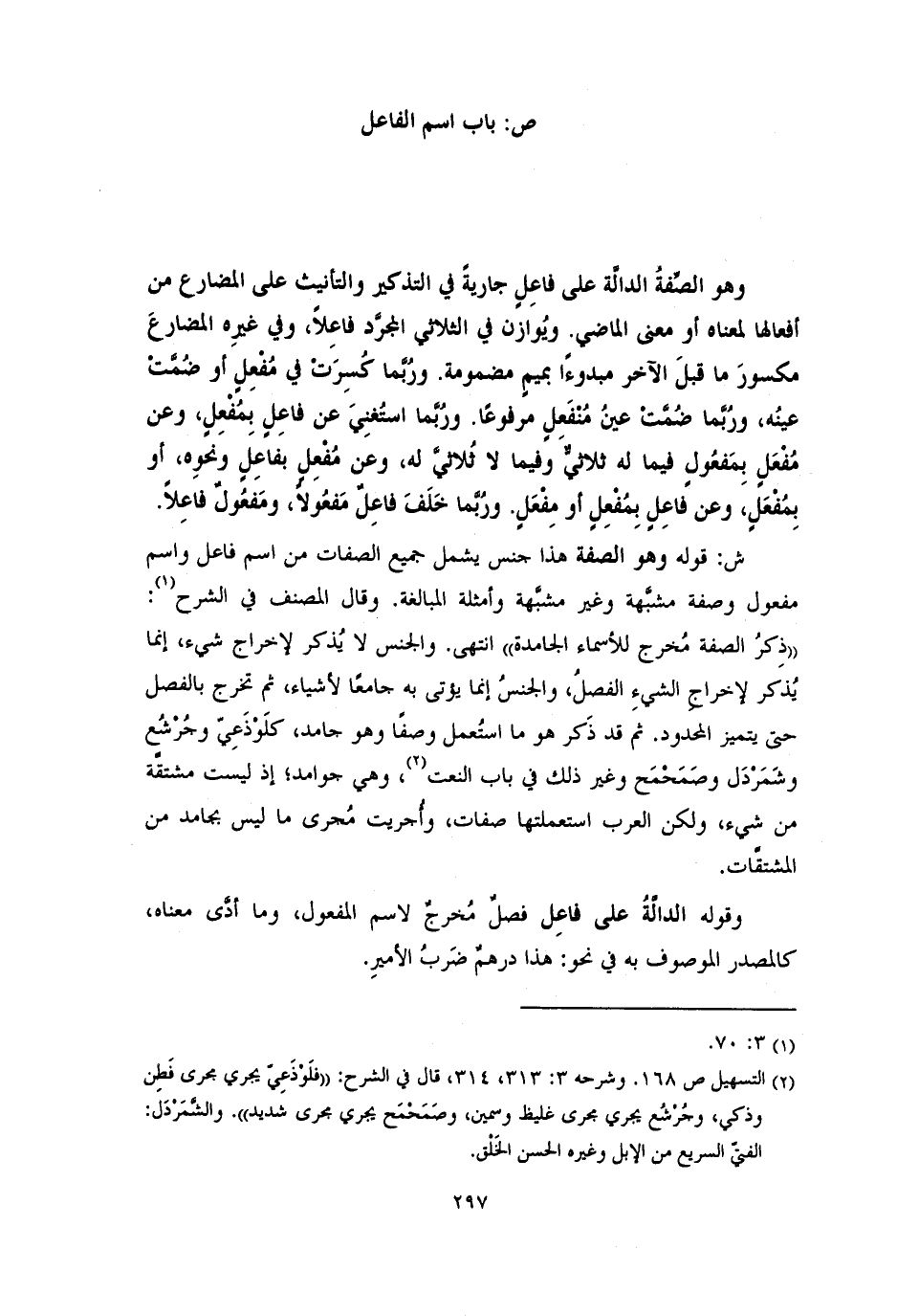 وقوله الدالَّةُ على فاعِل فصلٌ مُخرجٌ لا سم المفعول، وما أدَّى معناه، كالمصدر الموصوف به في نحو: هذا درهمٌ ضَربُ الأميرِ. ...