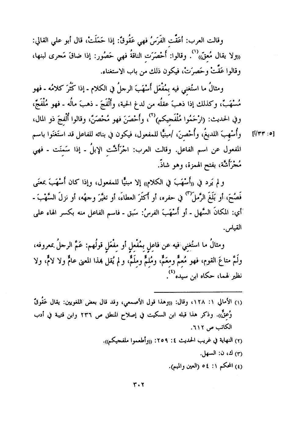 ومثالُ ما استُغنِي فيه بمُفْعَل أَسْهَبَ الرجلُ في الكلام ــــ إذا كَثُرَ كلامُه ــــ فهو مُسْهَبٌ، وكذلك إذا ذهبَ عقلُه من لدغ الحية، وأَلْفَجَ ــــ ذهبَ مالُه ـــ فهو مُلْفَجٌ، وفي الحديث: (ارْحَمُوا مُلْفَجيكم)، وأَحْصَنَ فهو مُحْصَنٌ، وقالوا أُلْفِجَ ذو المال، وأُسْهِبَ اللديغُ، وأُحْصِنَ، /مبنيَّا للمفعول، فيكون في بنائه للفاعل قد استَغنَوا باسم المفعول عن اسم الفاعل. وقالت العرب: اجْرَأَشَّتِ الإبلُ ـــــ إذا سَمِنَت ــــ فهي مُجْرَأَشَّة، بفتح الهمزة، وهو شاذّ.