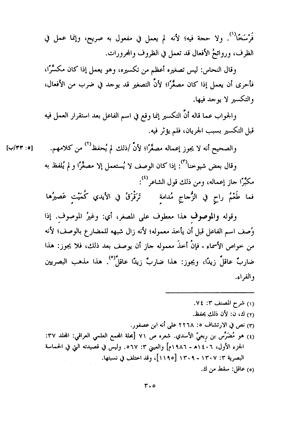 وقوله والموصوف هذا معطوف على المصغر، أي: وغيرُ الموصوفِ. إذا وُصف اسم الفاعل قبل أن يأخذ معموله؛ لأنه زال شبهه للمضارع بالوصف؛ لأنه من خواص الأسماء ــــ فإنْ أخذَ معموله جاز أن يوصف بعد ذلك، فلا يجوز: هذا ضاربٌ عاقلٌ زيدًا، ويجوز: هذا ضاربٌ زيدًا عاقلٌ. هذا مذهب البصريين والفراء.
