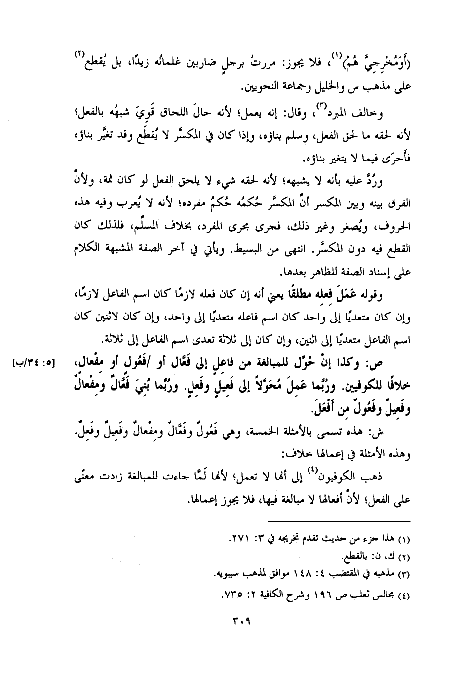 (أوَ مُخْرِجِيَّ هُمْ)، فلا يجوز: مررتُ برجلٍ ضاربين غلمانُه زيدًا، بل يُقطع على مذهب س والخليل وجماعة النحويين.