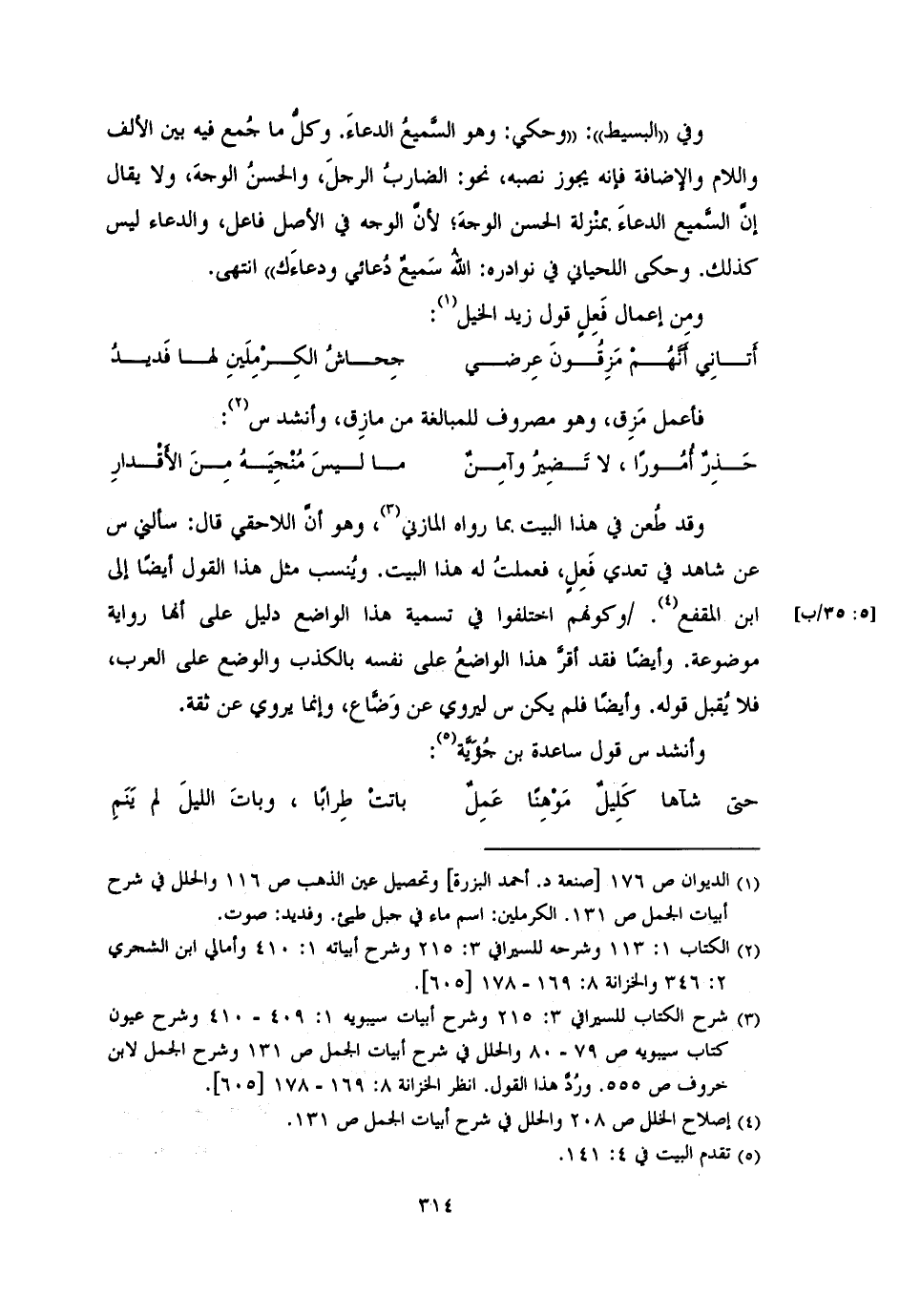وقد طُعن في هذا البيت بما رواه المازني، وهو أنَّ اللاحقي قال: سألني س عن شاهد في تعدي فَعِلٍ، فعلمتُ له هذا البيت. ويُنسب مثل هذا القول أيضًا إلى ابن المقنع. /وكونهم اختلفوا في تسمية هذا الواضع دليل على أنها رواية موضوعة. وأيضًا فقد أقرَّ هذا الواضعُ على نفسه بالكذب والوضع على العرب، فلا يُقبل قوله. وأيضًا فلم يكن س ليروي عن وَضَّاع، وإنما يروي عن ثقة.