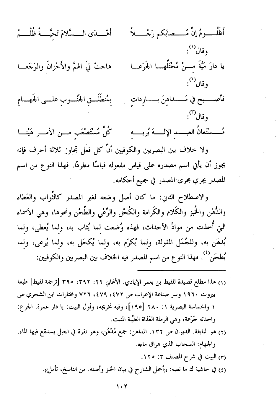 والاصطلاح الثاني: ما كان أصل وضعه لغير المصدر كالثواب والعطاء والدهن والخبز والكلام والكرامة والكحل والرعي والطحن ونحوها، وهي الأسماء التي أخذت من مواد الأحداث، فهذه وضعت لما يثاب به، ولما يعطى، ولما يدهن به، وللجمل المقولة، ولما يكرم به، ولما يكحل به، ولما يرعى، ولما يطحن. فهذا النوع من اسم المصدر فيه الخلاف بين البصريين والكوفيين: