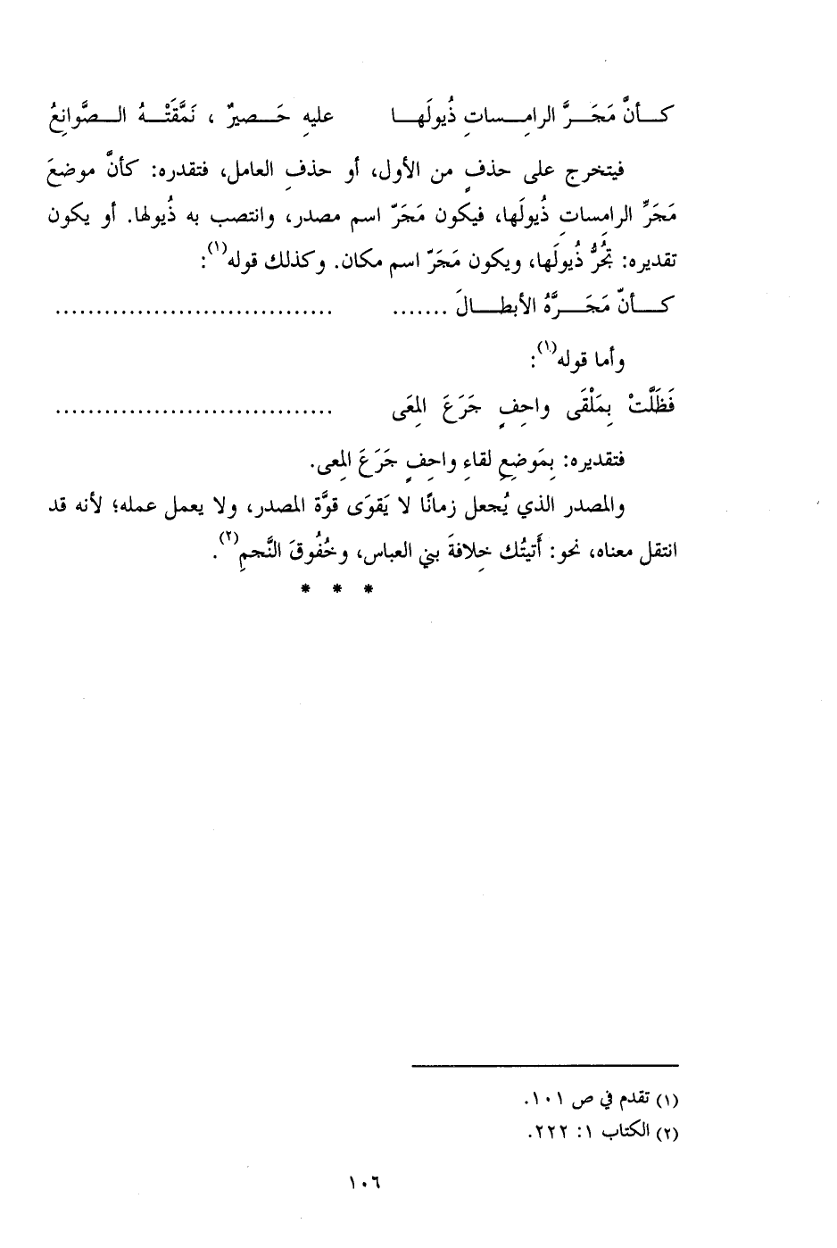فيتخرج على حذف من الأول، أو حذف العامل، فتقدره: كأن موضع مجر الرامسات ذيولها، فيكون مجر اسم مصدر، وانتصب به ذيولها. أو يكون تقديره: تجر ذيولها، ويكون مجر اسم مكان. وكذلك قوله: