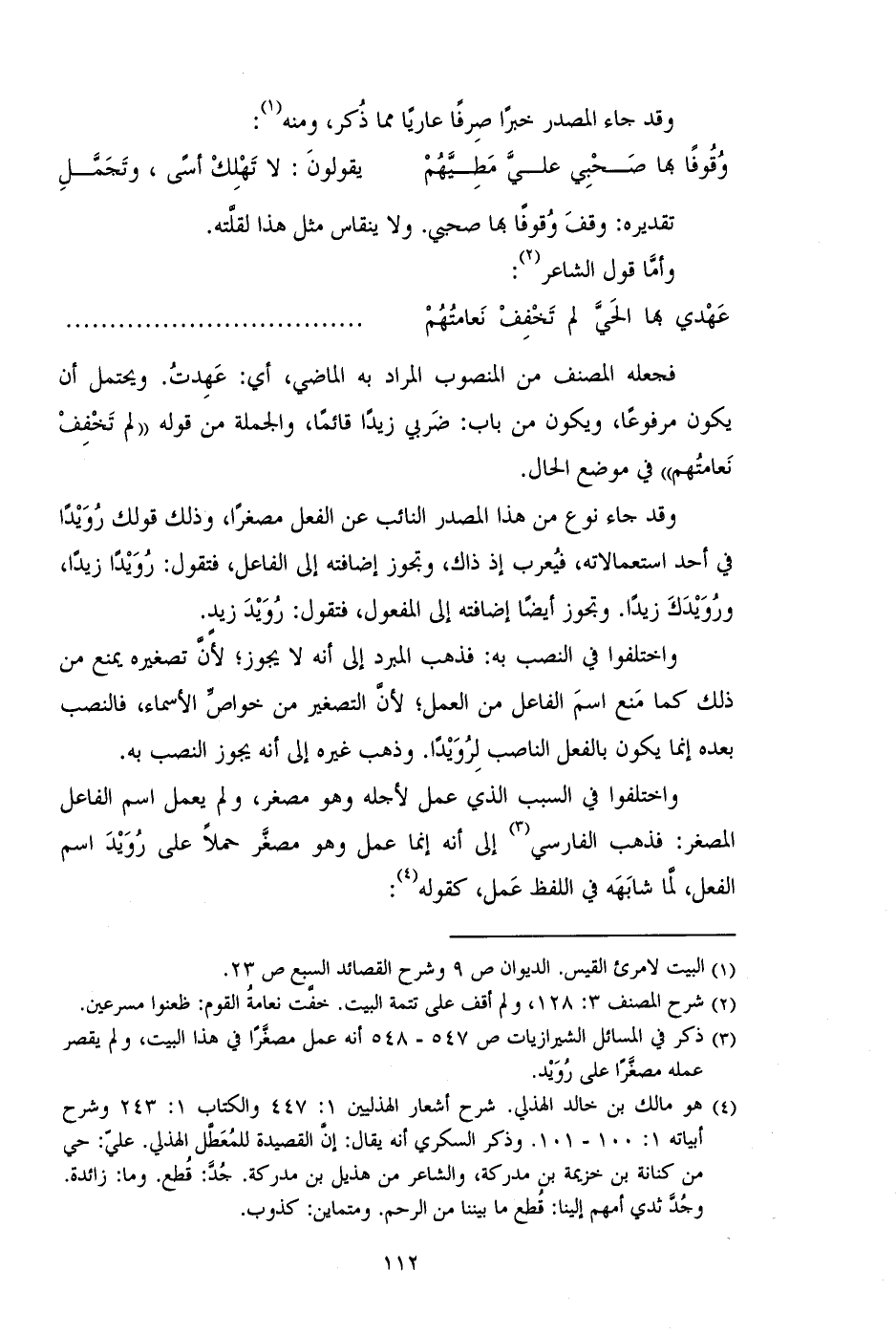 واختلفوا في النصب به: فذهب المبرد إلى أنه لا يجوز؛ لأن تصغيره يمنع من ذلك كما منع اسم الفاعل من العمل؛ لأن التصغير من خواس الأسماء، فالنصب بعده إنما يكون بالفعل الناصب لرويداً. وذهب غيره إلى أنه يجوز النصب به.