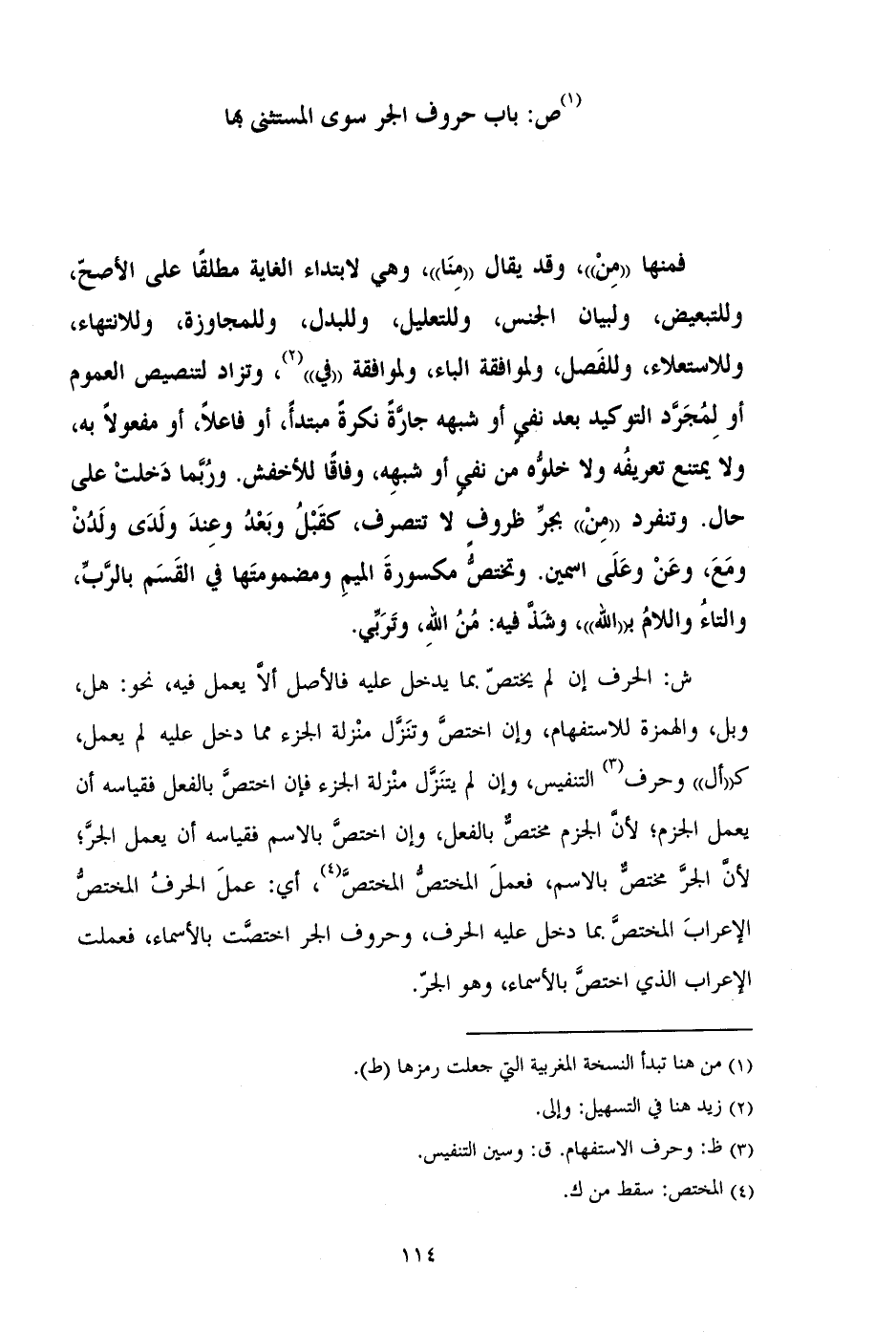 فمنها "من"، وقد يقال "منا"، وهي لابتداء الغاية مطلقاً على الأصح، وللتبعيض، ولبيان الجنس، وللتعليل، وللبدل، وللمجاوزة، وللانتهاء، وللاستعلاء، وللفصل، ولموافقة الباء، ولموافقة "في"، وتزاد لتنصيص العموم أو لمجرد التوكيد بعد نفي أو شبهه جارة نكرة مبتدأ، أو فاعلاً، أو مفعولاً به، ولا يمتنع تعريفه ولا خلوه من نفي أو شبهه، وفاقاً للأخفش. وربما دخلت على حال. وتنفرد "من" بجر ظروف لا تتصرف، كقبل وبعد وعند ولدى ولدن ومع، وعن وعلى اسمين. وتختص مكسورة الميم ومضمومتها في القسم بالرب، والتاء واللام بـ"الله"، وشذ فيه: من الله، وتربي.]-