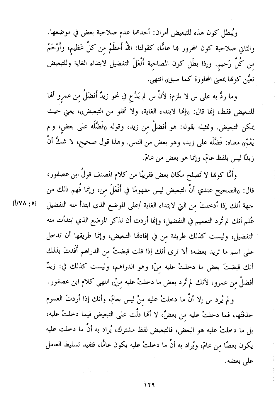 وأما كونها لا تصلح مكان بعض فقريباً من كلام المصنف قول ابن عصفور، قال: "الصحيح عندي أن التبعيض ليس مفهوماً في أفعل من، وإنما فهم ذلك من جهة أنك إذا أدخلت من التي لابتداء الغاية/ على الموضع الذي ابتدأ منه التفضيل علم أنك لم ترد التعميم في التفضيل؛ وإنما أردت أن تذكر الموضع الذي ابتدأت منه التفضيل، وليست كذلك طريقة من في إفادتها التبعيض، وإنما طريقها أن تدخل على اسم ما تريد بعضه؛ ألا ترى أنك إذا قلت قبضت من الدراهم أفدت بذلك أنك قبضت بعض ما دخلت عليه من؛ وهو الدراهم، وليست كذلك في: زيد أفضل من عمرو، لأنك لم ترد بعض ما دخلت عليه من" انتهى كلام ابن عصفور.