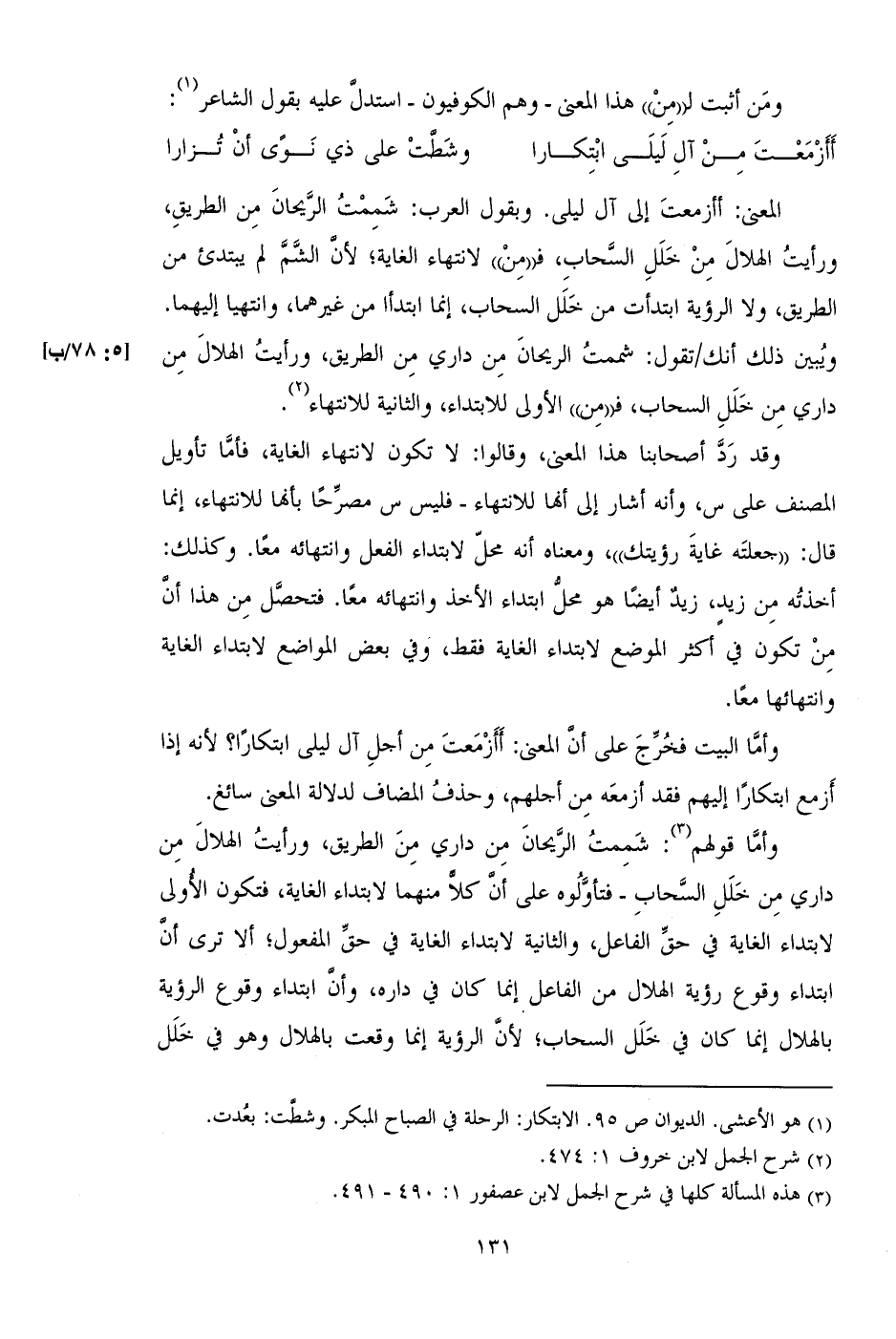 وأما قولهم: شممت الريحان من داري من الطريق، ورأيت الهلال من داري من خلل السحاب - فتأولوه على أن كلا منهما لابتداء الغاية، فتكون الأولى لابتداء الغاية في حق الفاعل، والثانية لابتداء الغاية في حق المفعول؛ ألا ترى أن ابتداء وقوع رؤية الهلال من الفاعل إنما كان في داره، وأن ابتداء وقوع الرؤية بالهلال إنما كان في خلل السحاب؛ لأن الرؤية إنما وقعت بالهلال وهو في خلل