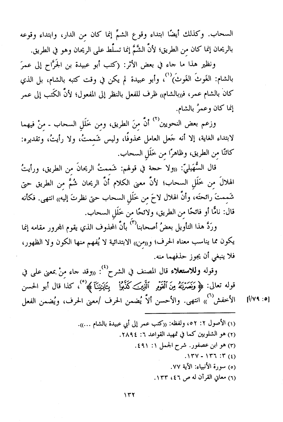 قال السهيلي: "ولا حجة في قولهم: شممت الريحان من الطريق، ورأيت الهلال من خلل السحاب؛ لأن معنى الكلام أن الريحان شم من الطريق حتى شممت رائحته، وأن الهلال لاح من خلل السحاب حتى نظرت إليه)) انتهى. فكأنه قال: ناما أو فائحاً من الطريق، ولائحاً من خلل السحاب.