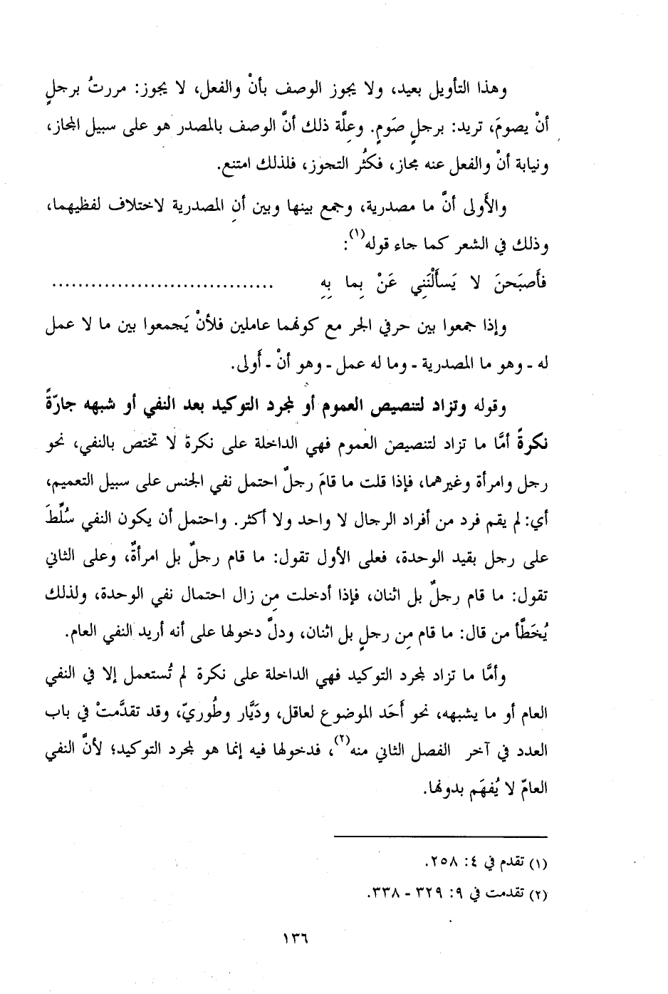 وقوله وتزاد لتنصيص العموم أو لمجرد التوكيد بعد النفي أو شبهه جارة نكرة أما ما تزاد لتنصيص العموم فهي الداخلة على نكرة لا تختص بالنفي، نحو رجل وامرأة وغيرهما، فإذا قلت ما قام رجل احتمل نفي الجنس على سبيل التعميم، أي: لم يقم فرد من أفراد الرجال لا واحد ولا أكثر. واحتمل أن يكون النفي سلط على رجل بقيد الوحدة، فعلى الأول تقول: ما قام رجل بل امرأة، وعلى الثاني تقول: ما قام رجل بل اثنان، فإذا أدخلت من زال احتمال نفي الوحدة، ولذلك يخطأ من قال: ما قام من رجل بل اثنان، ودل دخولها على أنه أريد النفي العام.