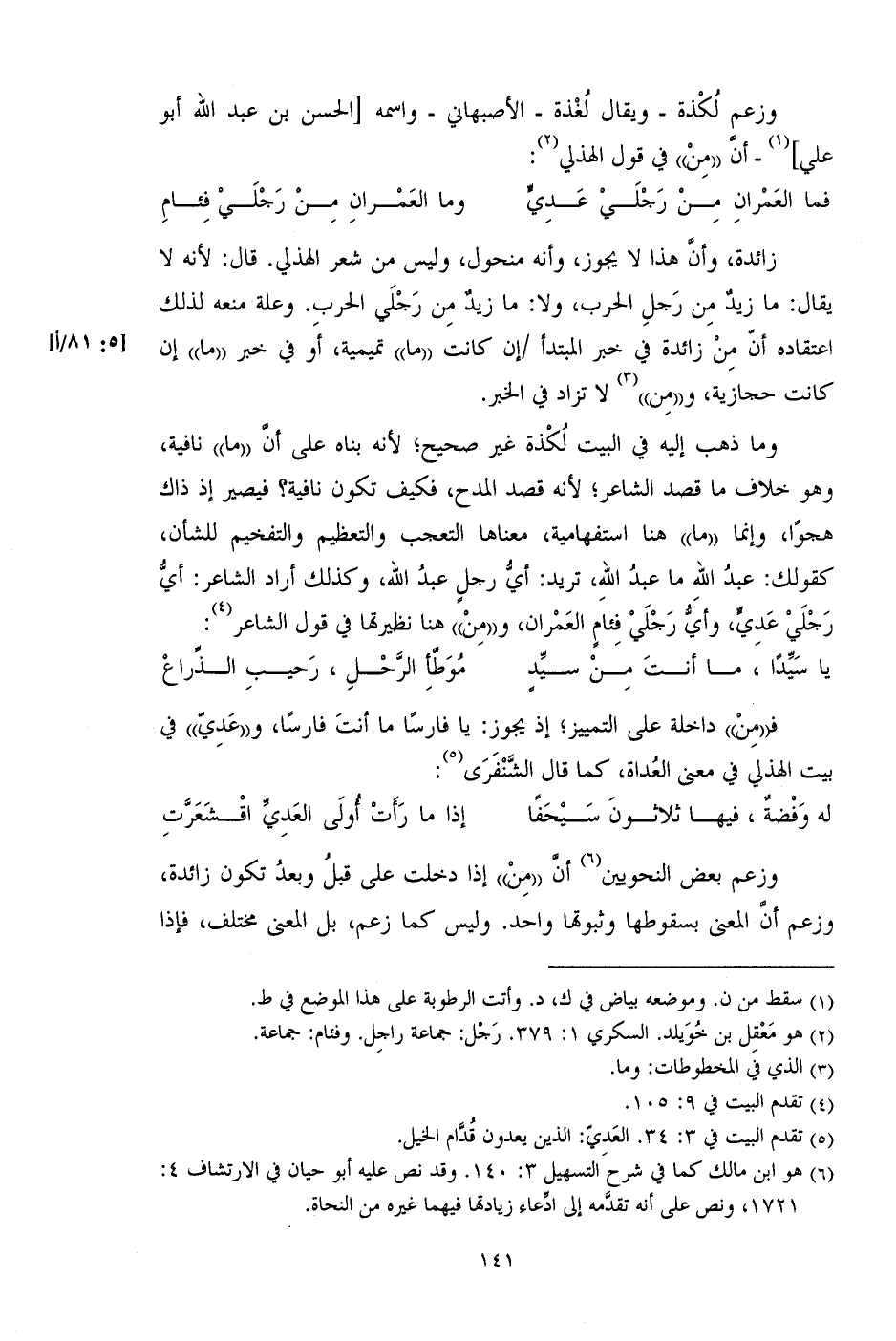 وما ذهب إليه في البيت لكذة غير صحيح؛ لأنه بناه على أن "ما" نافية، وهو خلاف ما قصد الشاعر؛ لأنه قصد المدح، فكيف تكون نافية؟ فيصير إذ ذاك هجواً، وإنما "ما" هنا استفهامية، معناها التعجب والتعظيم والتفخيم للشأن، كقولك: عبد الله ما عبد الله، تريد: أي رجل عبد الله، وكذلك أراد الشاعر: أي رجلي عدي، وأي رجلي فئام العمران، و"من" هنا نظيرتها في قول الشاعر: