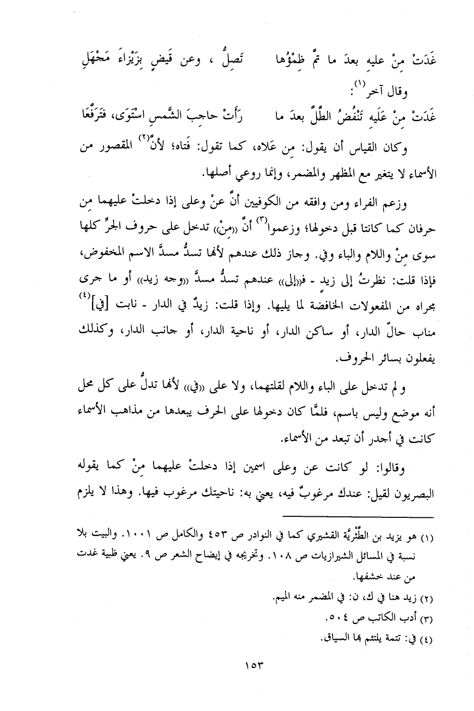وزعم الفراء ومن وافقه من الكوفيين أن عن وعلى إذا دخلت عليهما من حرفان كما كانتا قبل دخولها؛ وزعموا أن "من" تدخل على حروف الجر كلها سوى من واللام والباء وفي. وجاز ذلك عندهم لأنها تسد مسد الاسم المخفوض، فإذا قلت: نظرت إلى زيد - فـ"إلى" عندهم تسد مسد "وجه زيد" أو ما جرى مجراه من المفعولات الخافضة لما يليها. وإذا قلت: زيد في الدار - نابت [في] مناب حال الدار، أو ساكن الدار، أو ناحية الدار، أو جانب الدار، وكذلك يفعلون بسائر الحروف.