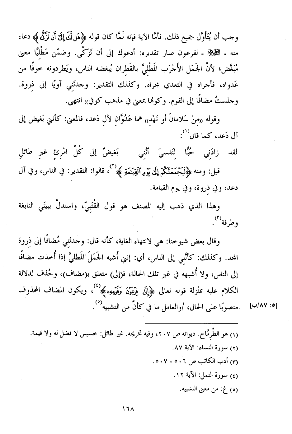 وقال بعض شيوخنا: هي لانتهاء الغاية، كأنه قال: وجدتني مضافاً إلى ذروة المجد. وكذلك: كأنني إلى الناس، أي: إنني أشبه الجمل المطلي إذا أخذت مضافاً إلى الناس، ولا أشبهه في غير تلك الحالة، فـ (إلى) متعلق بـ (مضاف)، وحذف لدلالة الكلام عليه بمنزلة قوله تعالى (إِلَى فِرْعَوْنَ وَقَوْمِهِ)، ويكون المضاف المحذوف منصوباً على الحال، /والعامل ما في كأن من التشبيه.